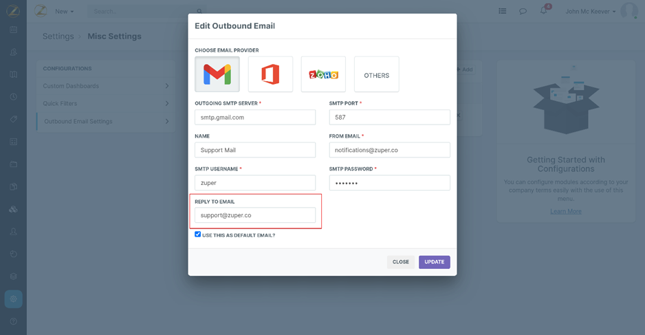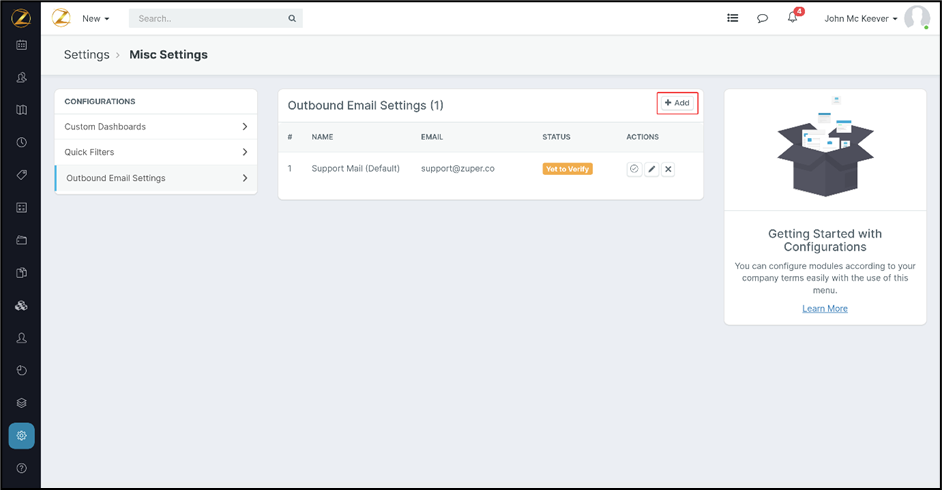 You can easily choose a default outbound email by editing the existing email box from the settings. The preferred email can also be selected from the list of email providers available. 1. Select the "Settings" module from the left panel. 2. Tap on ...