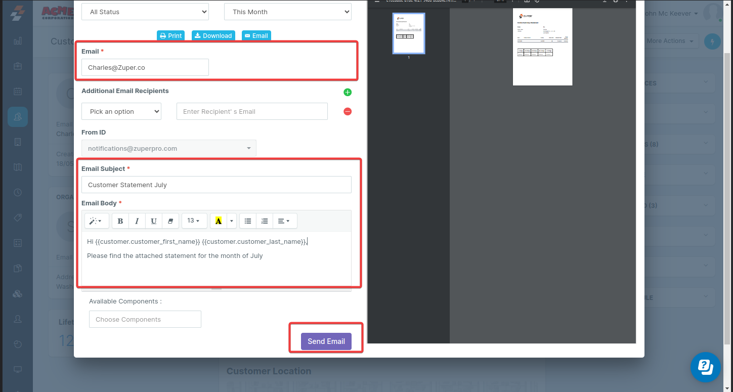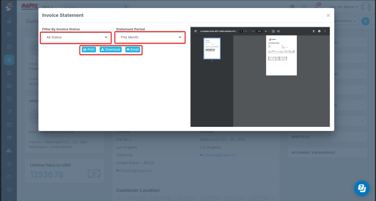 Note: You can preview the invoice statement in the right-side panel of the pop-up.