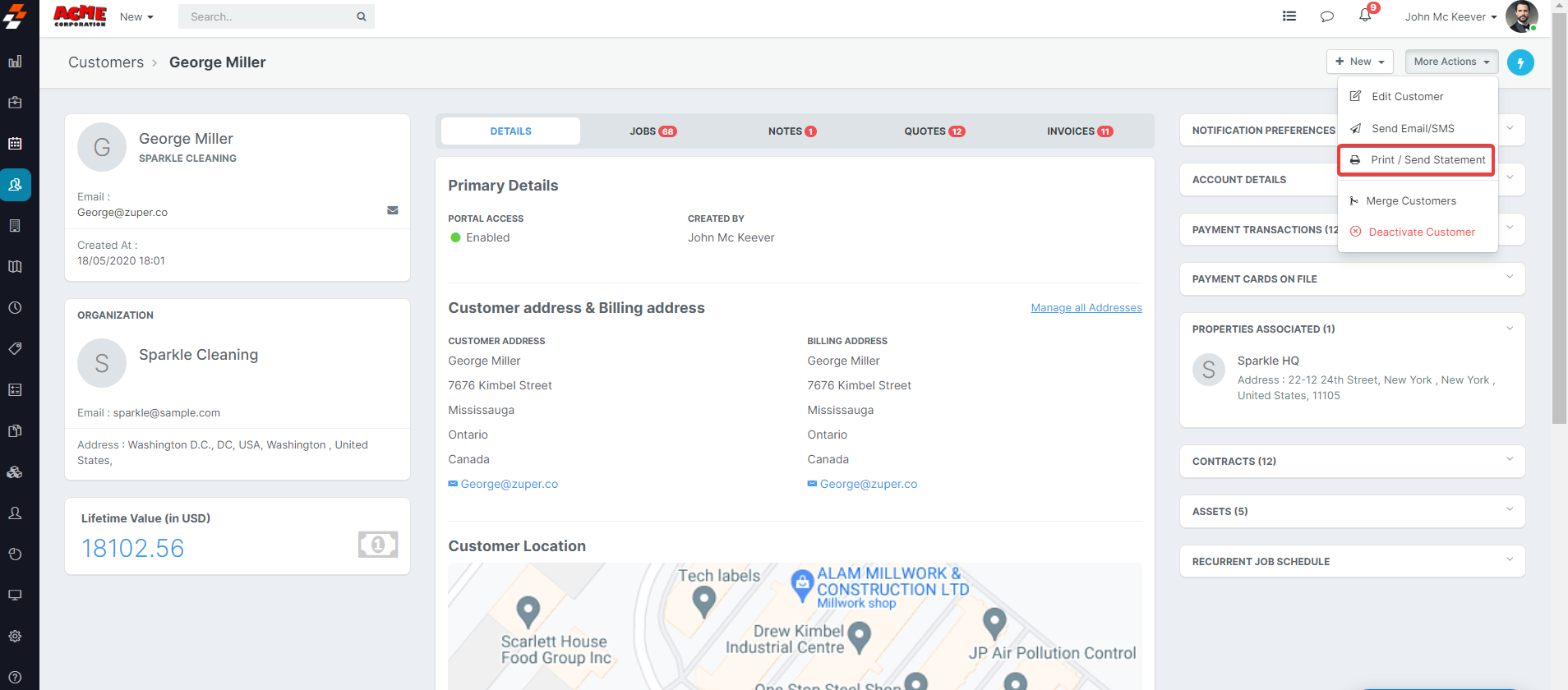 Navigation: Customers --> Customer --> More Actions -->Print / Send StatementEmail – Click