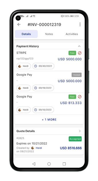 The Invoice details page lets you view the complete information of the invoice and all its associated records in a single place. From the invoice listing page, you can click any one of the Invoice No. to go to the invoice details page. Navigation: ...