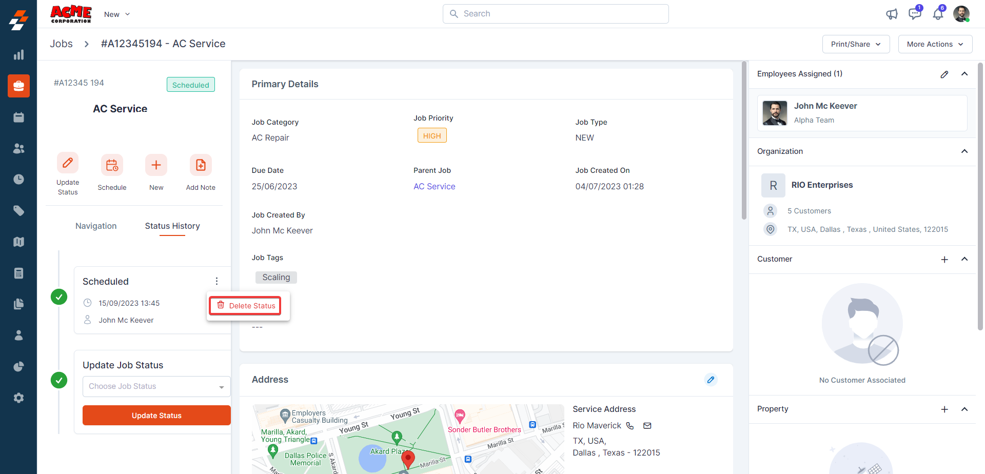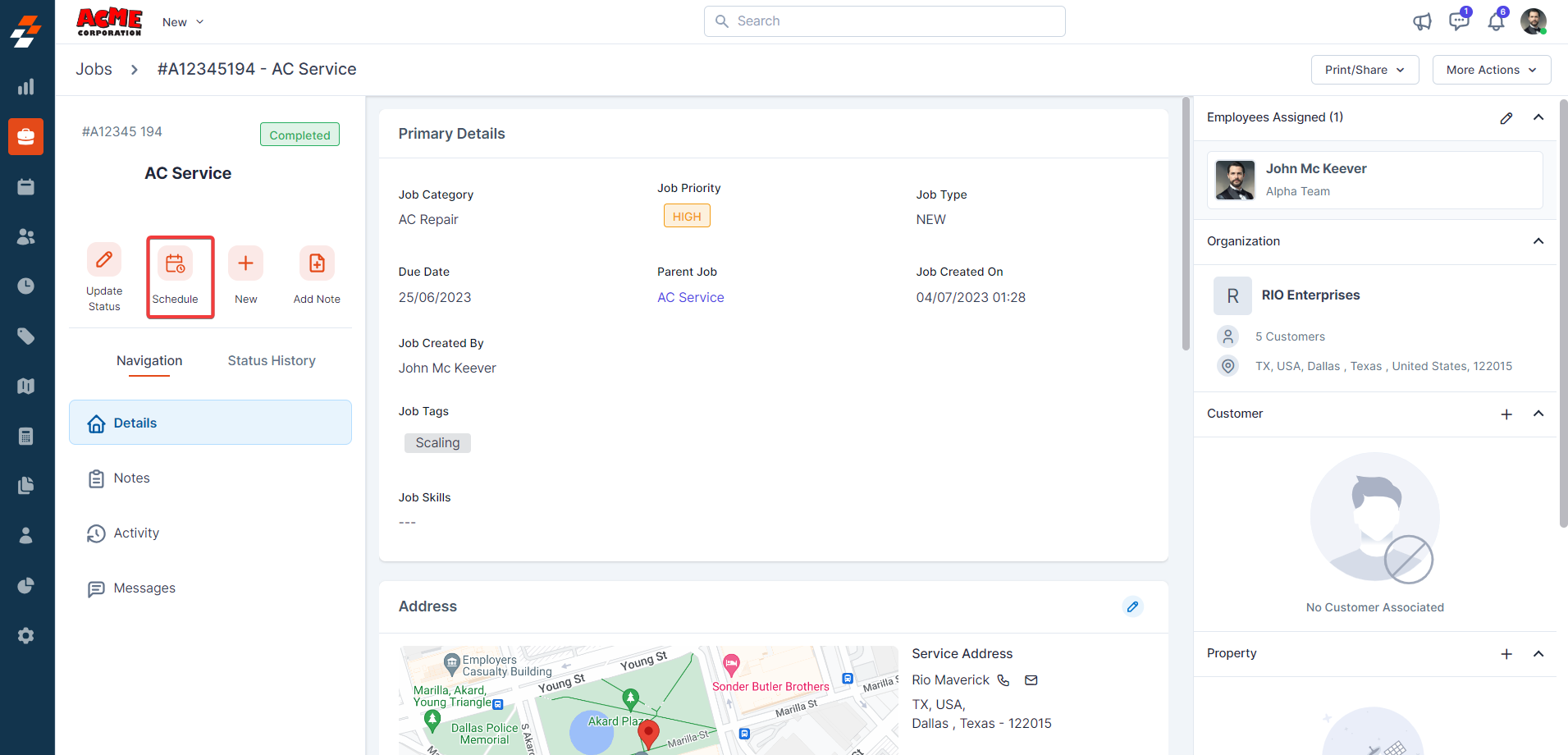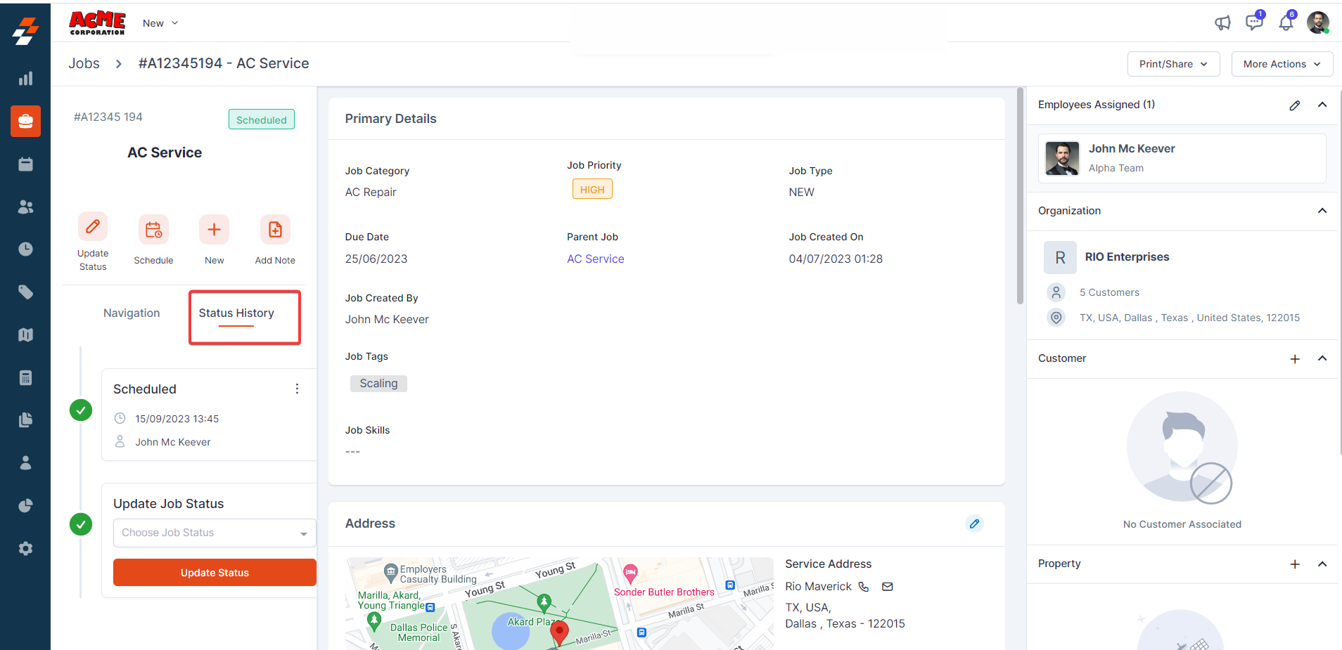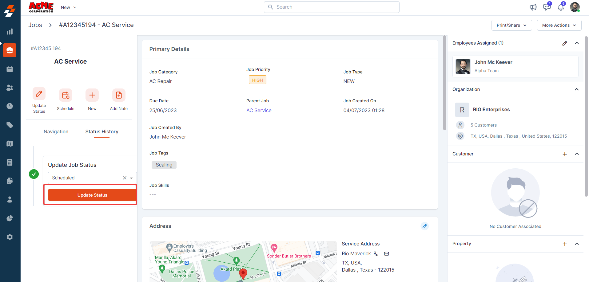 contextual action buttons such as Update Job Status, Schedule Job, Add a Note,