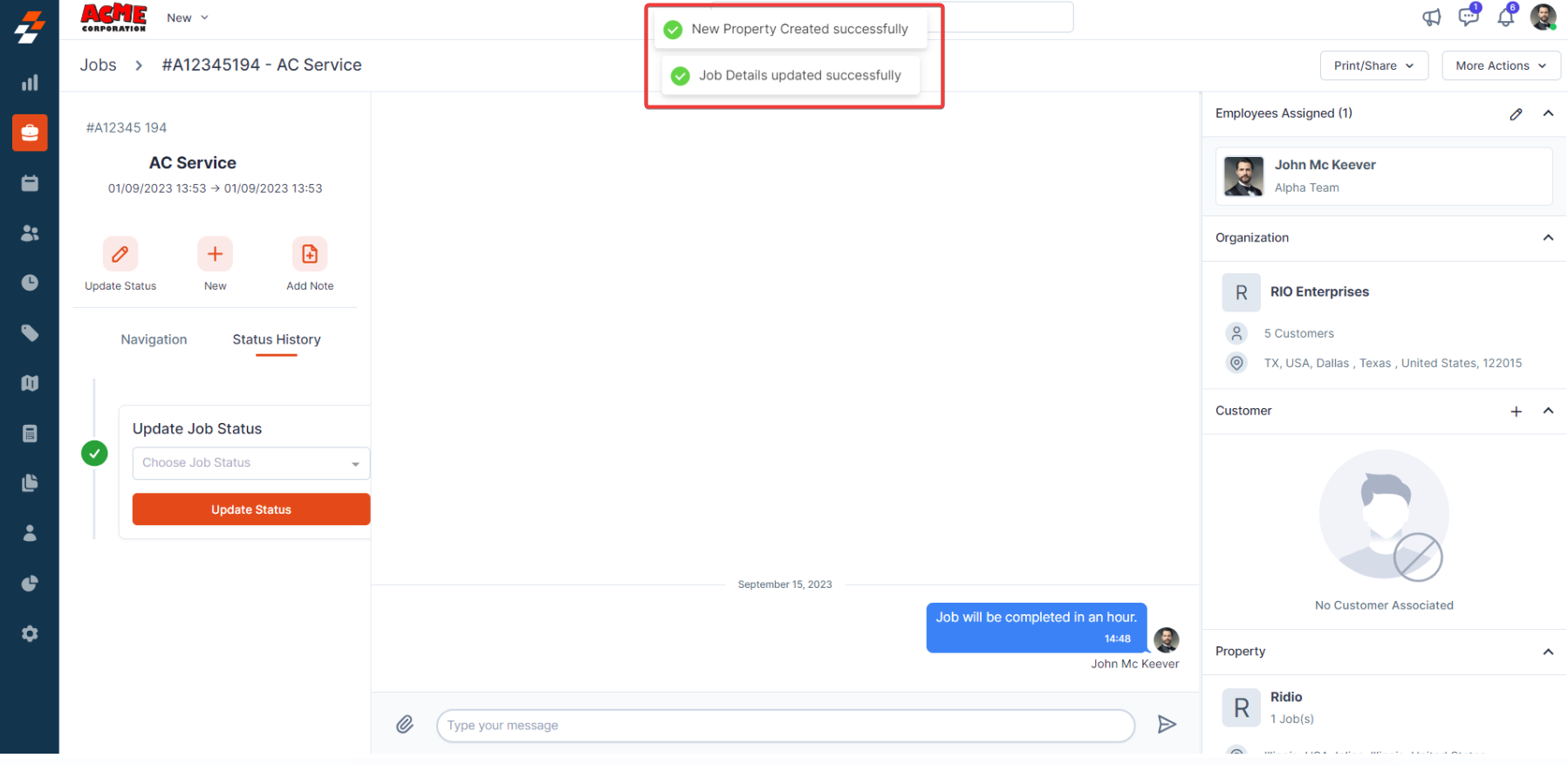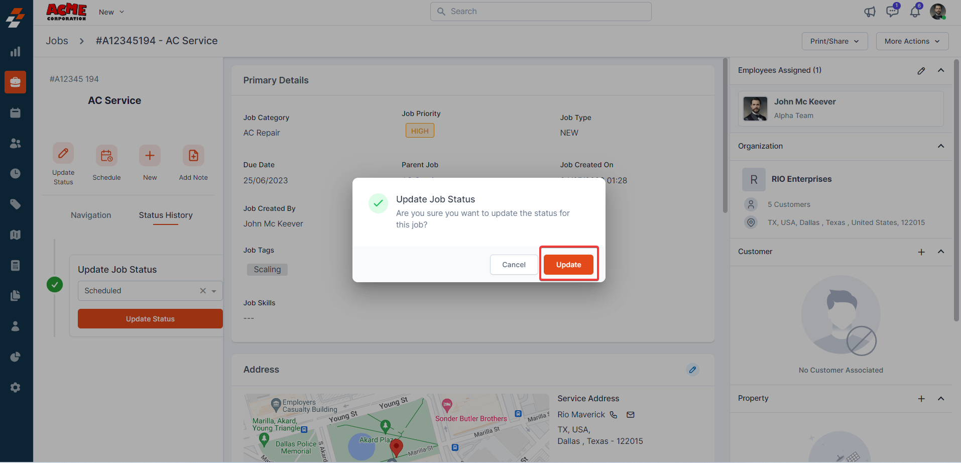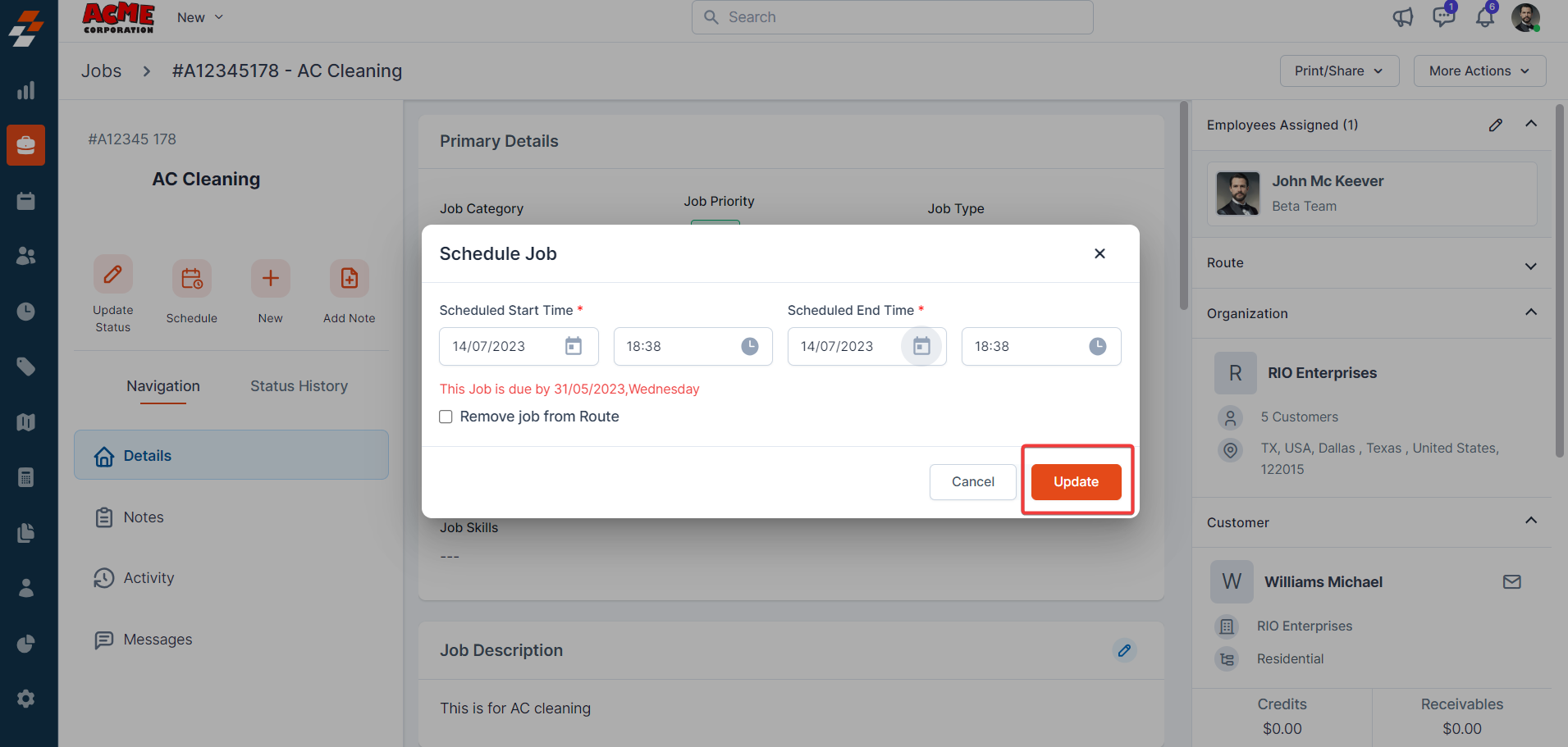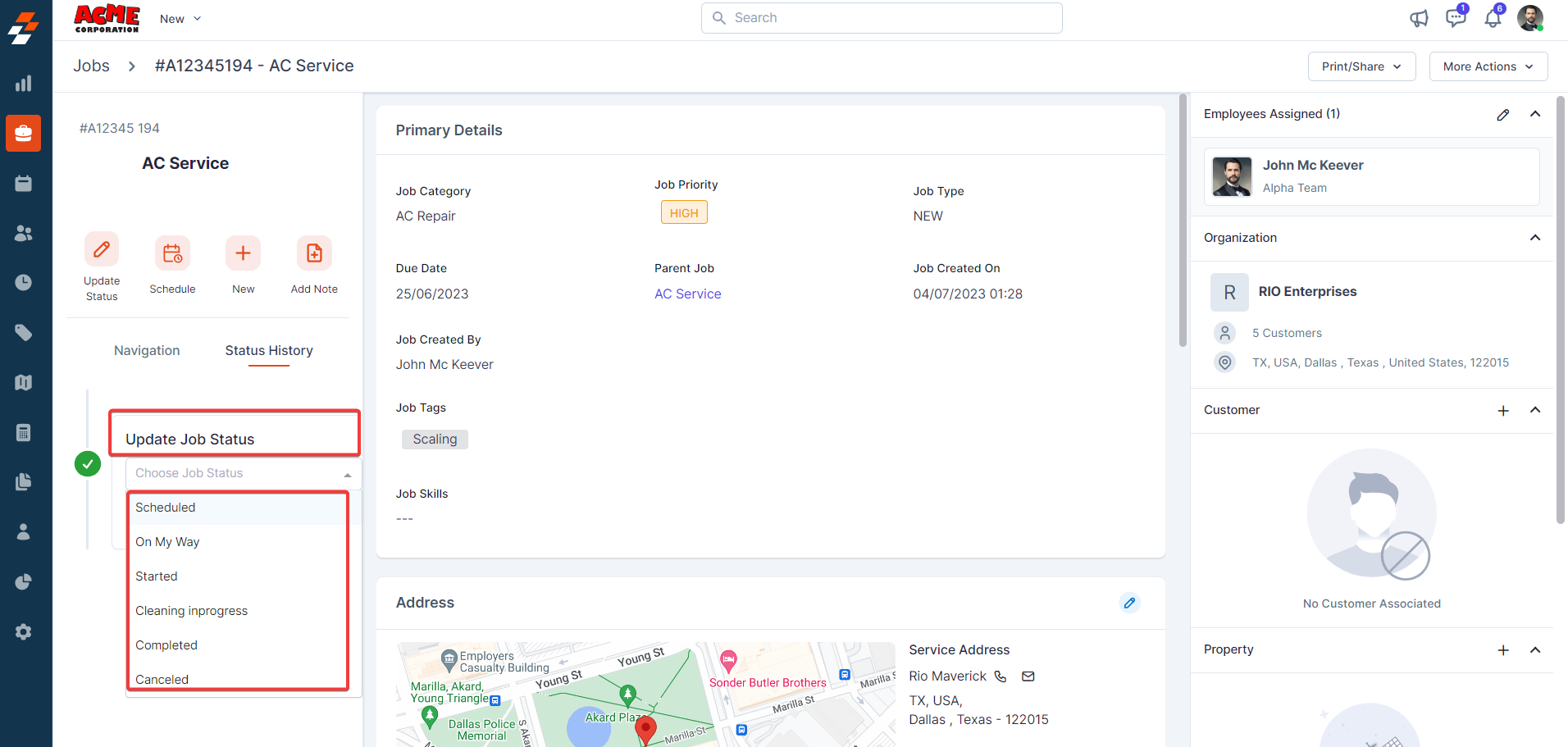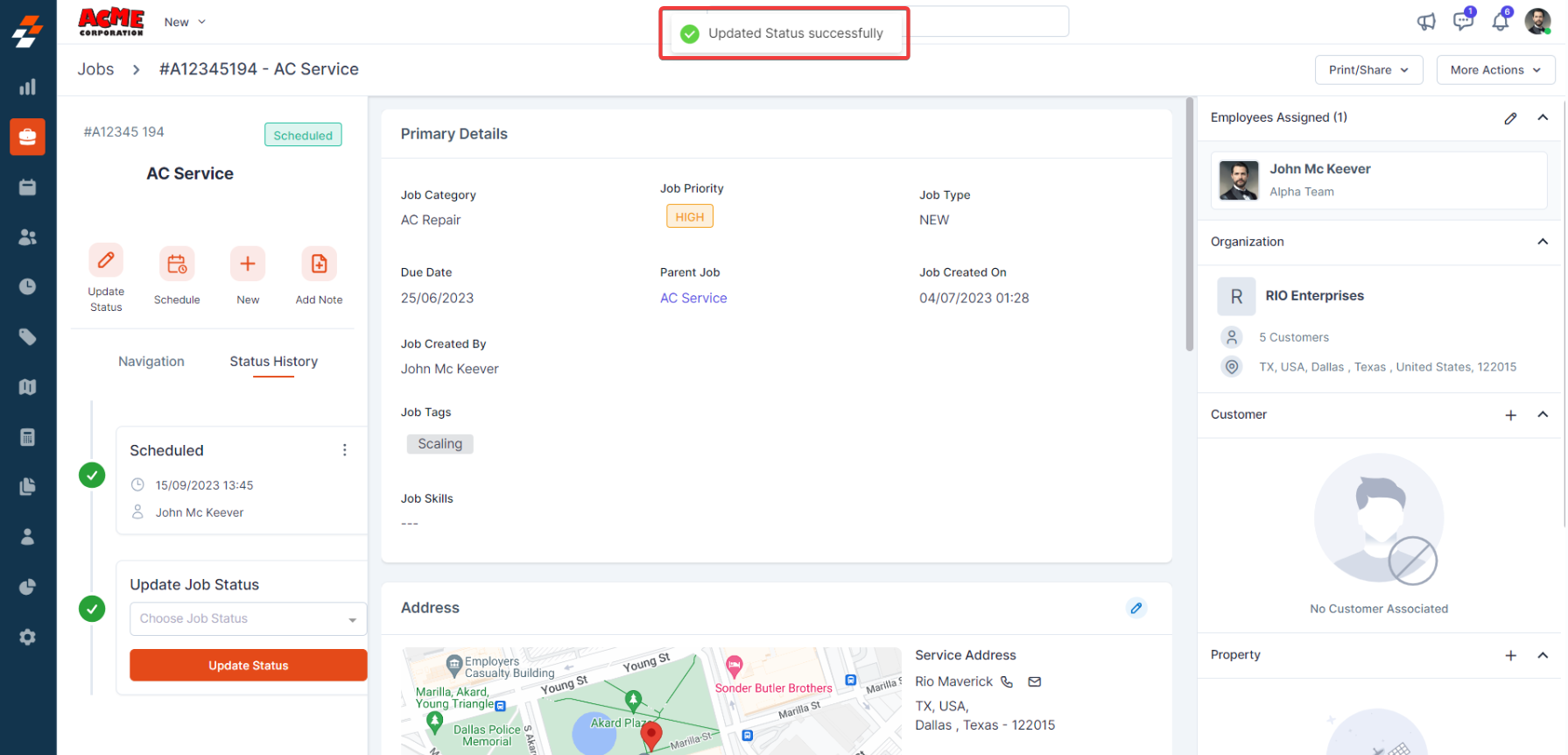 contextual action buttons such as Update Job Status, Schedule Job, Add a Note,