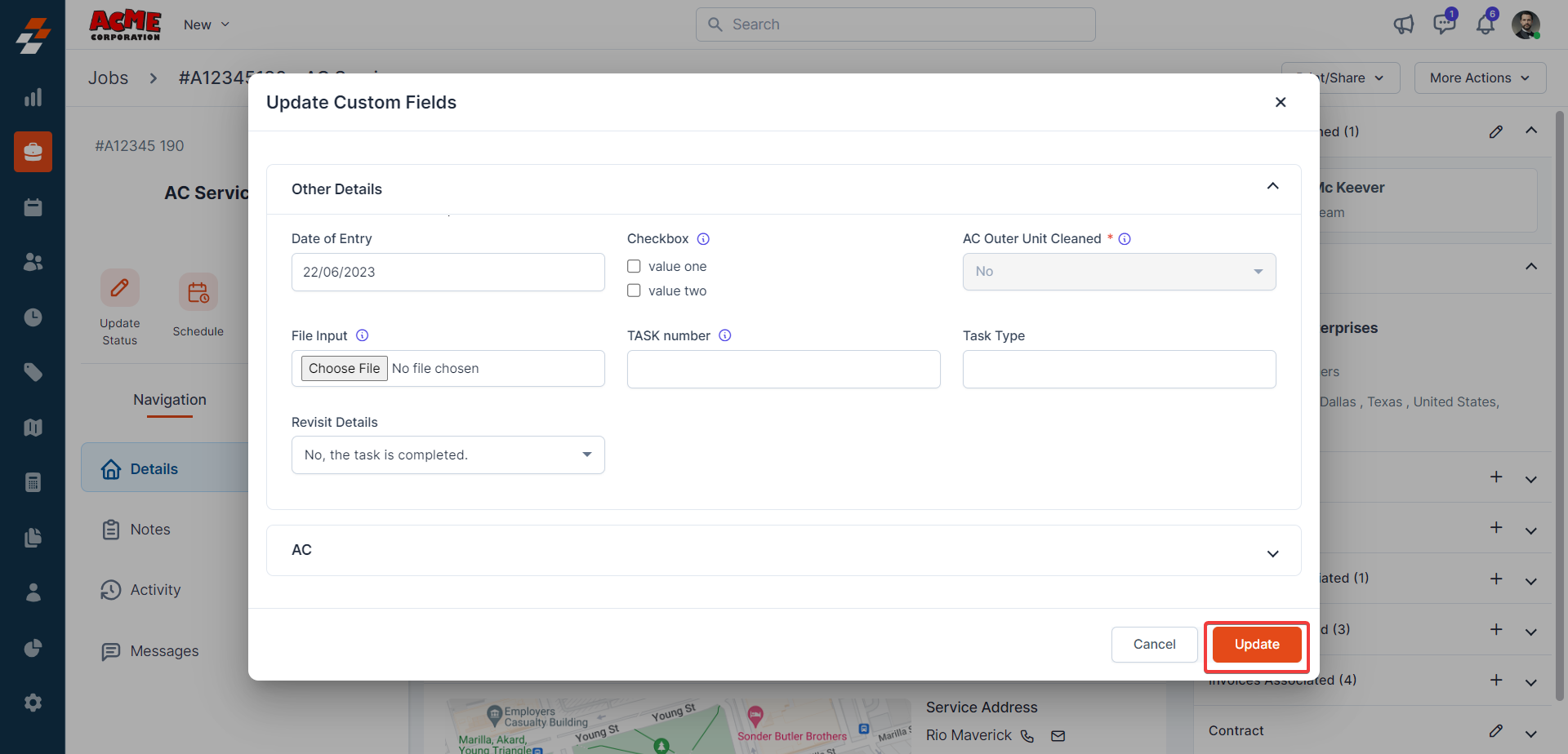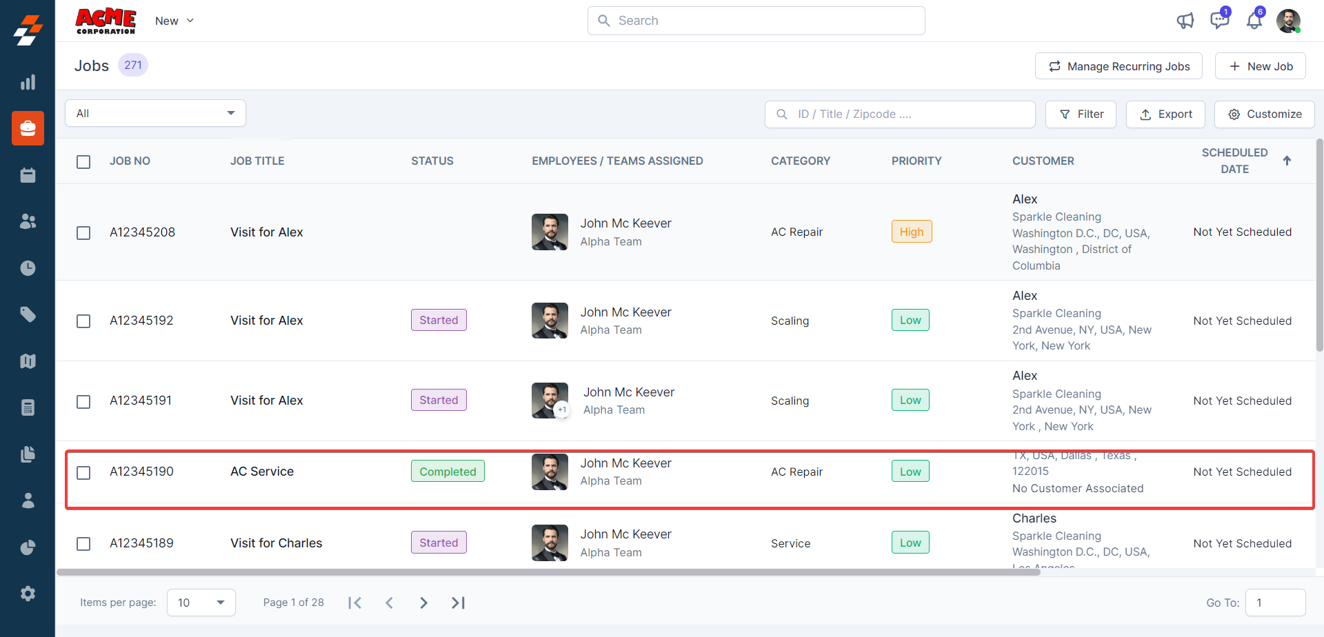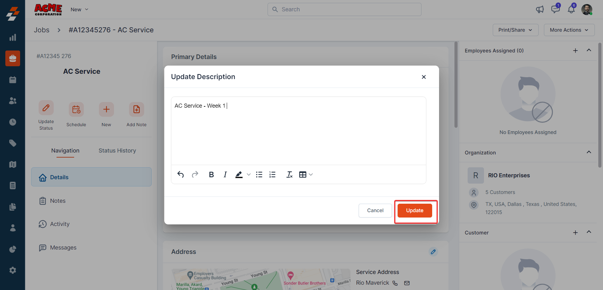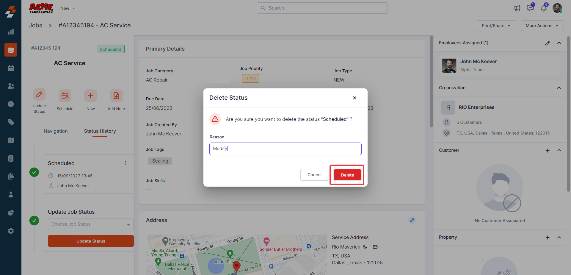 contextual action buttons such as Update Job Status, Schedule Job, Add a Note,