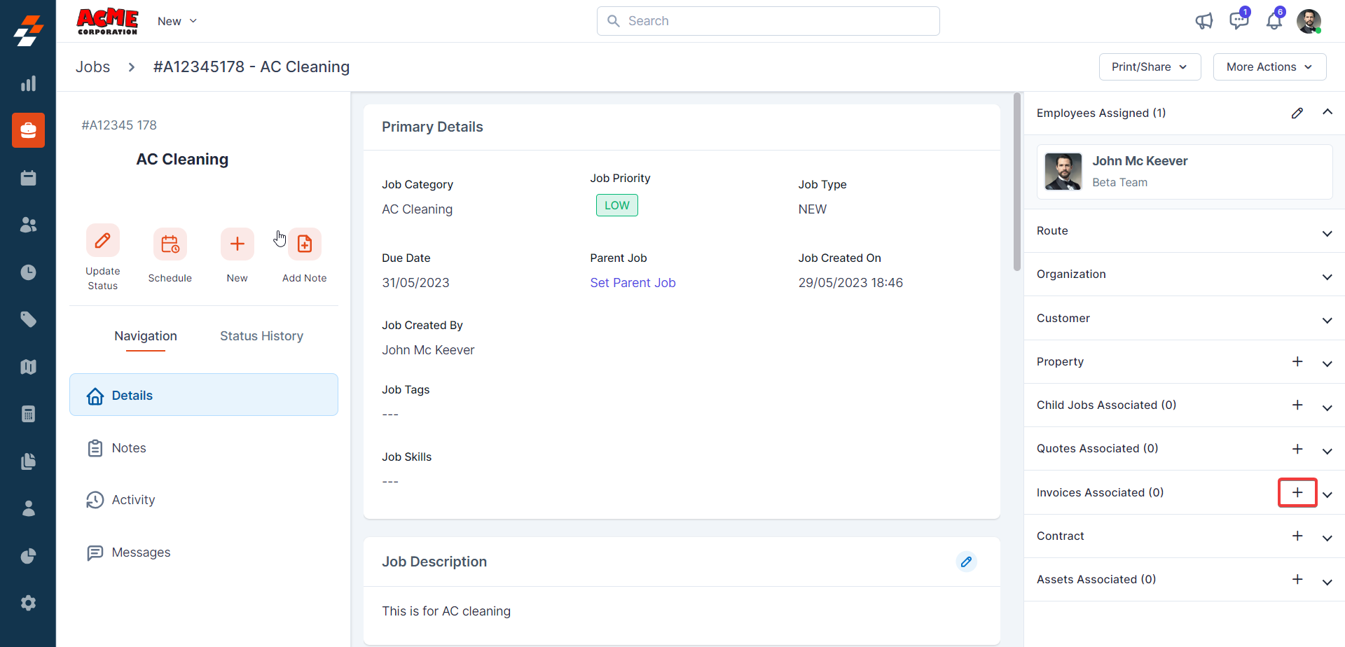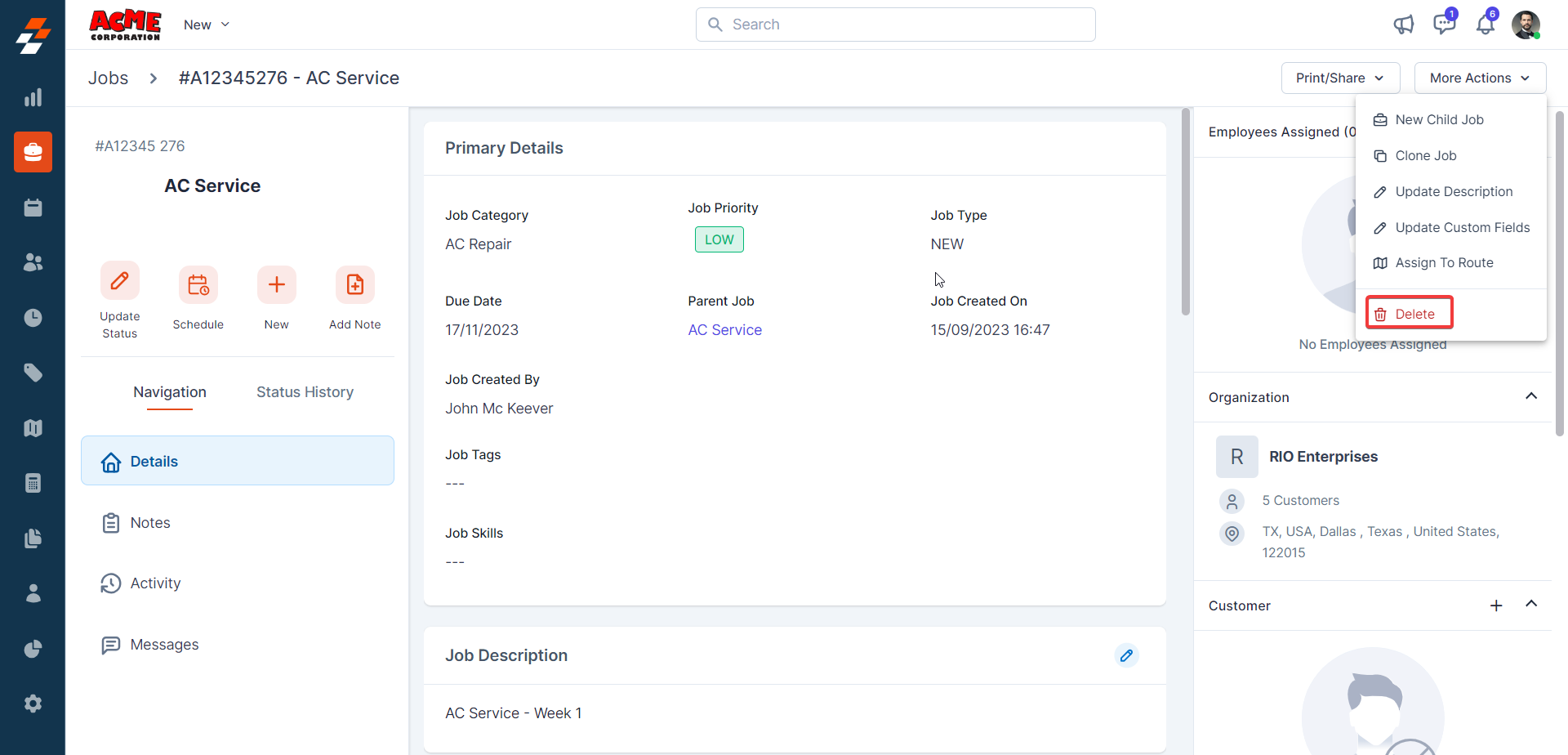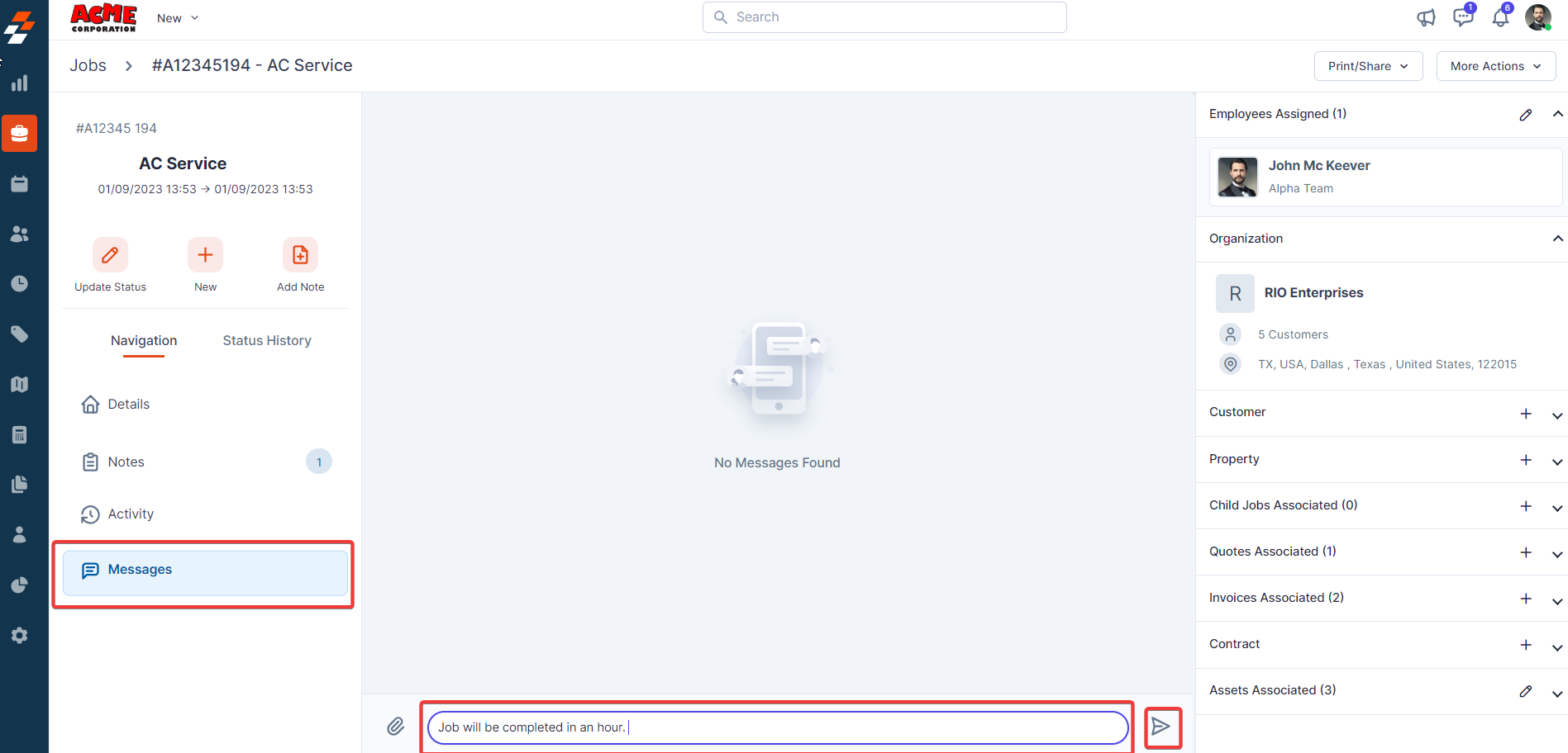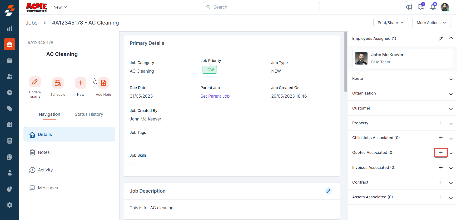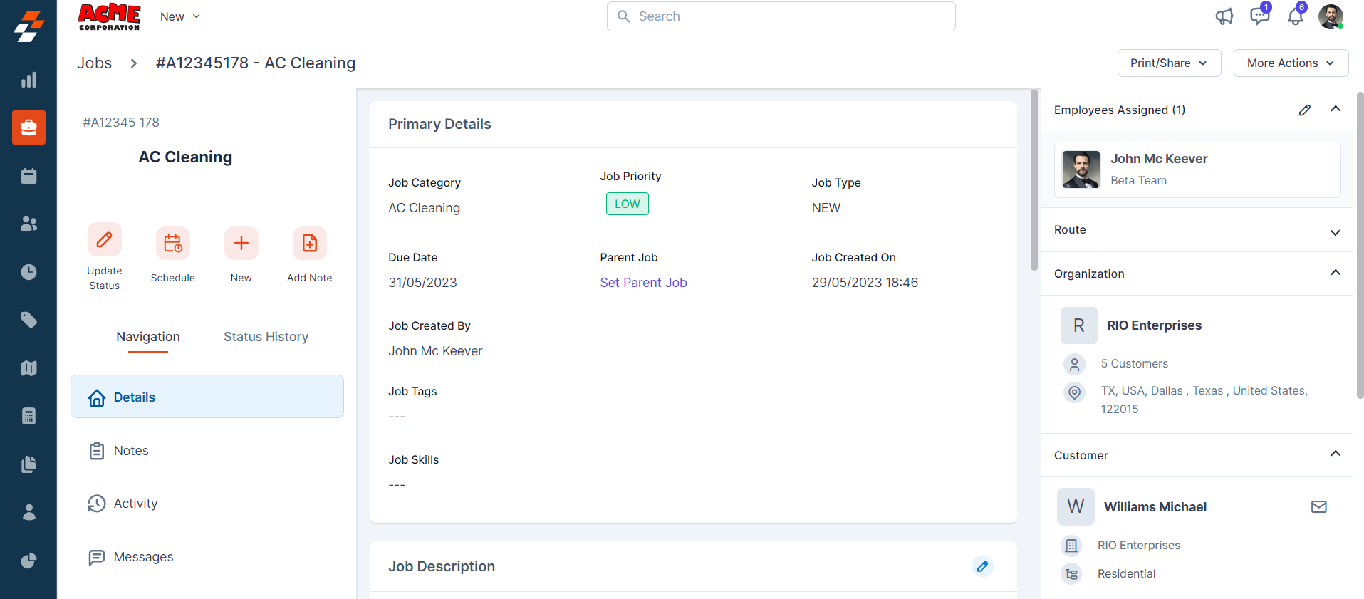 Using the navigation menu, you can navigate to the various sections of the job, including Details, Notes, Activity, and Messages.