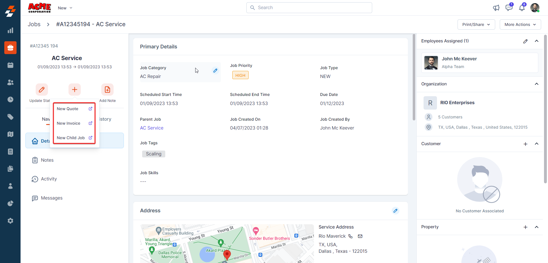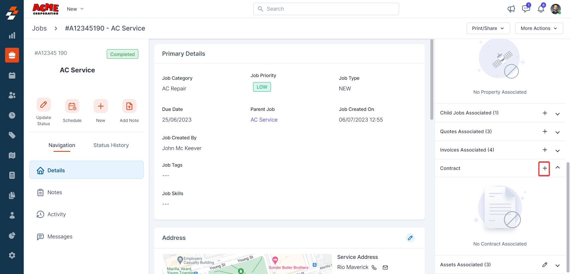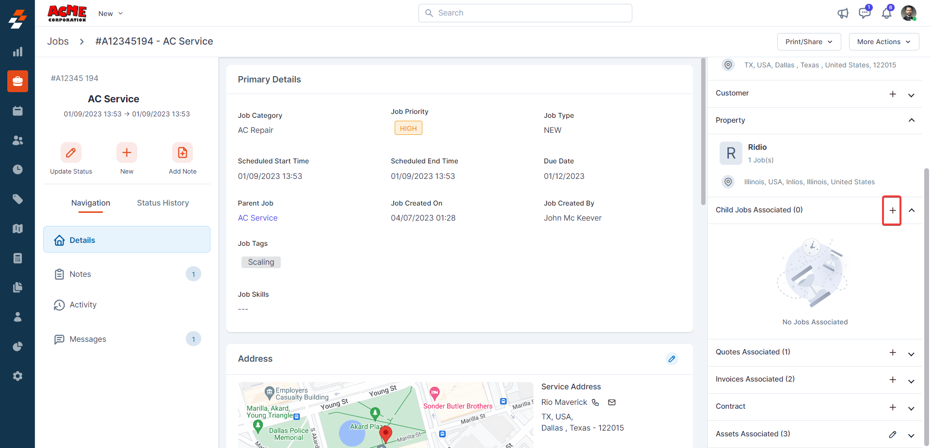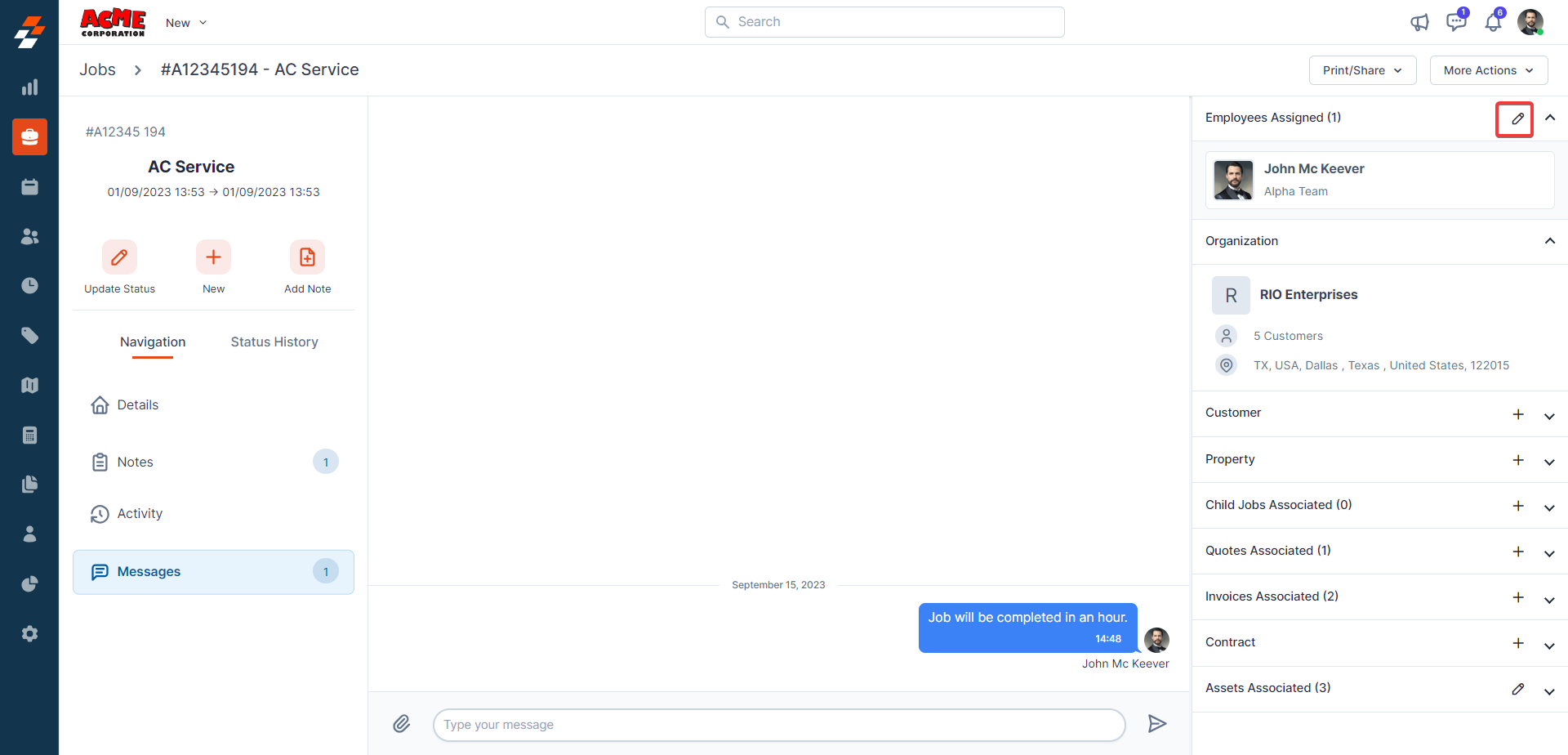 Using the navigation menu, you can navigate to the various sections of the job, including Details, Notes, Activity, and Messages.