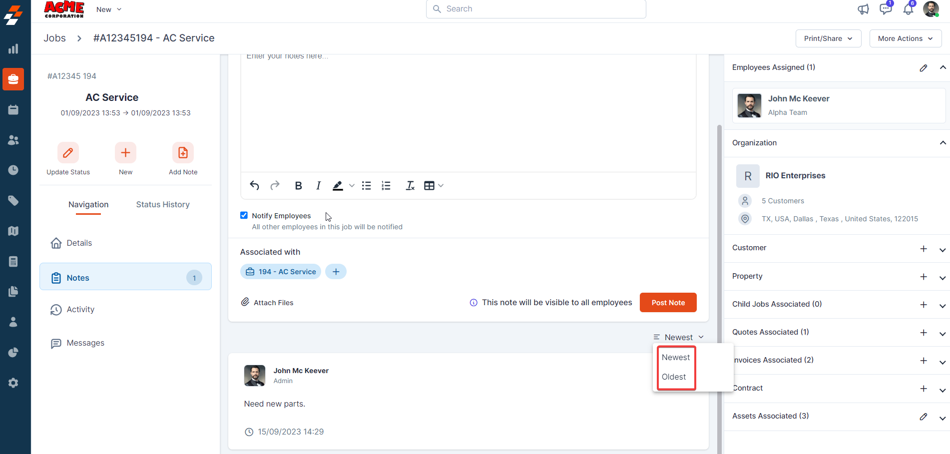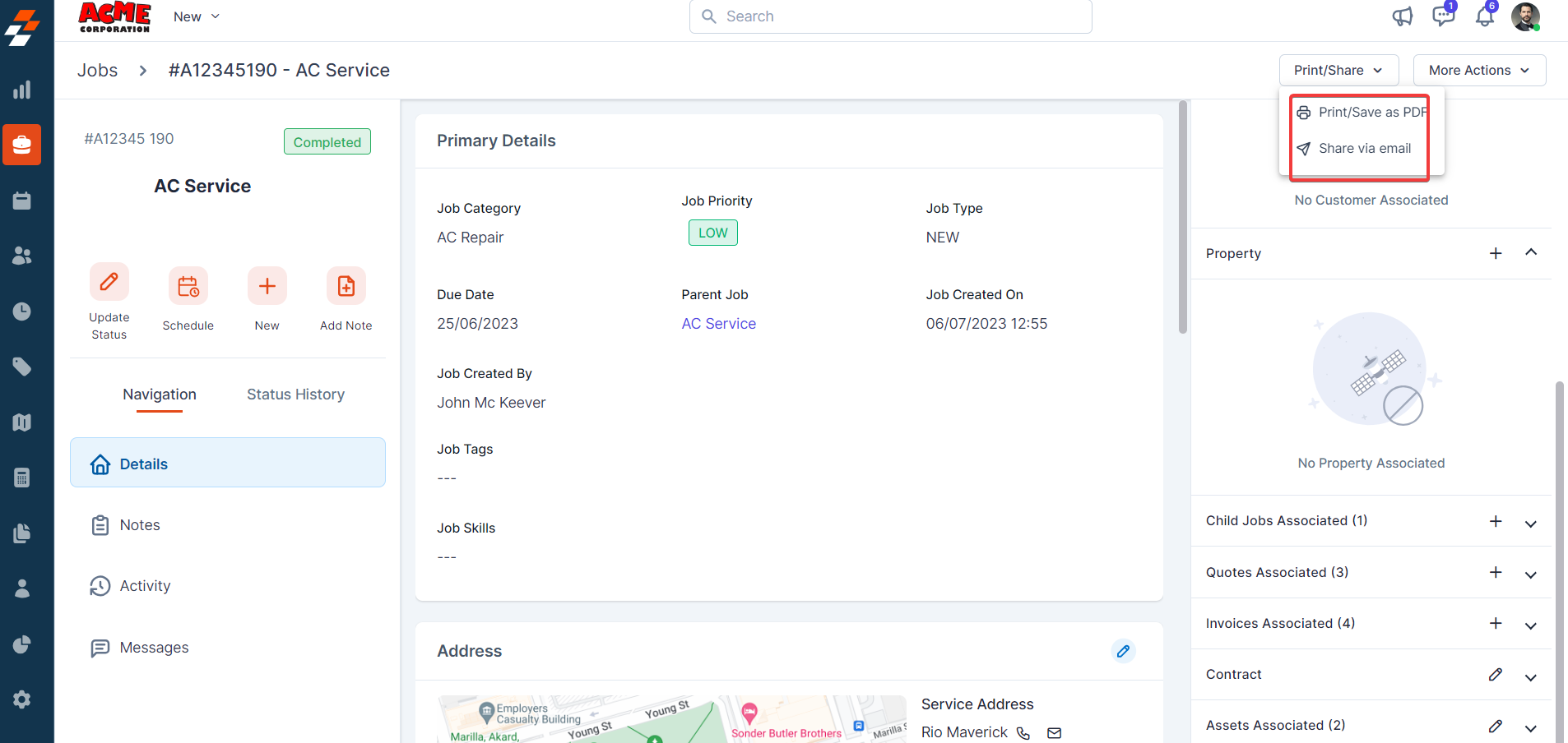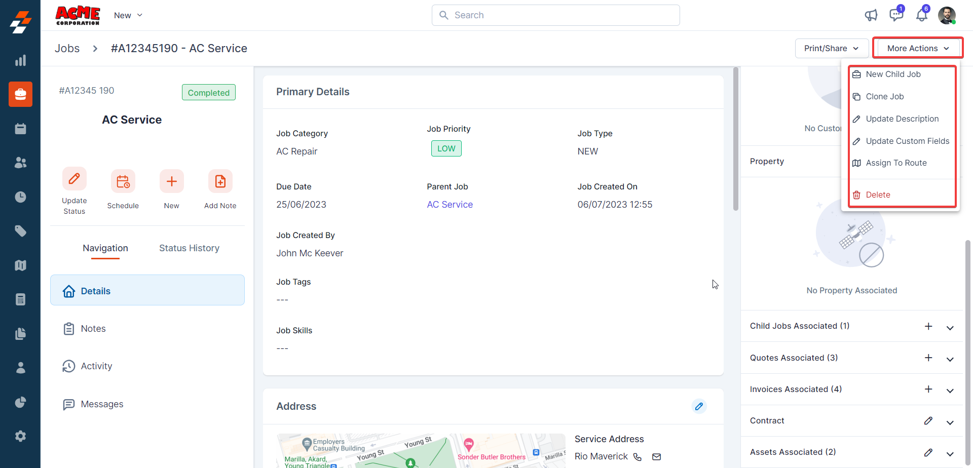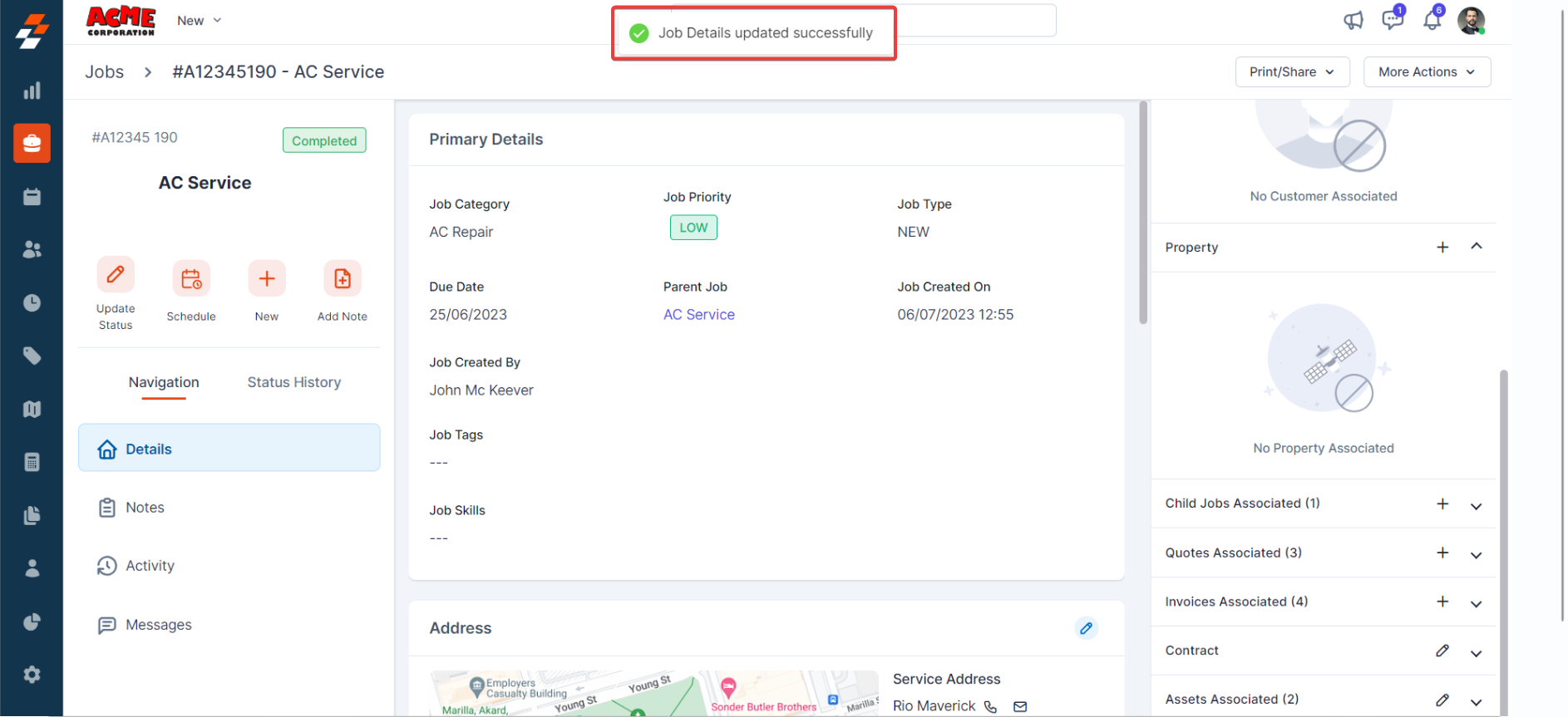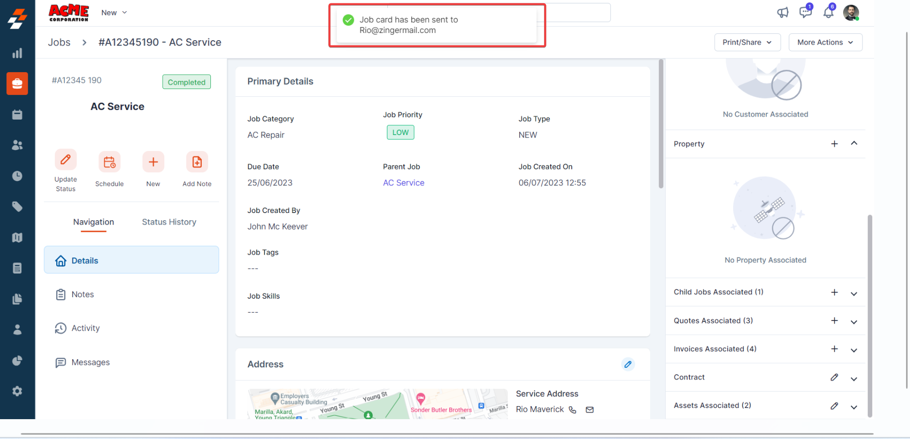Using the navigation menu, you can navigate to the various sections of the job, including Details, Notes, Activity, and Messages.