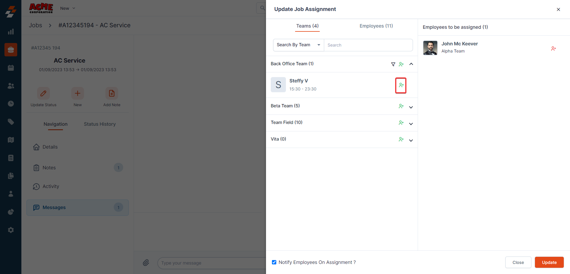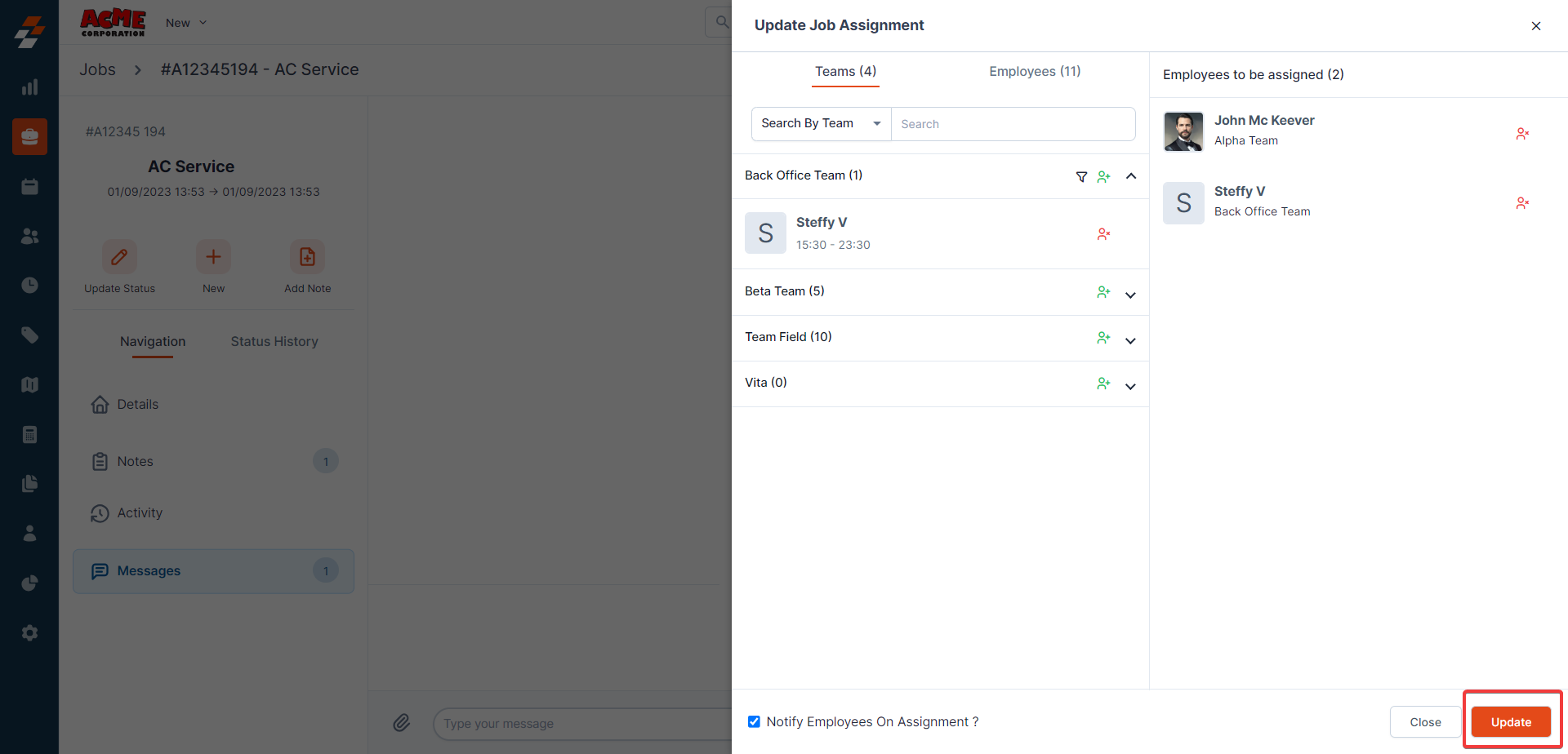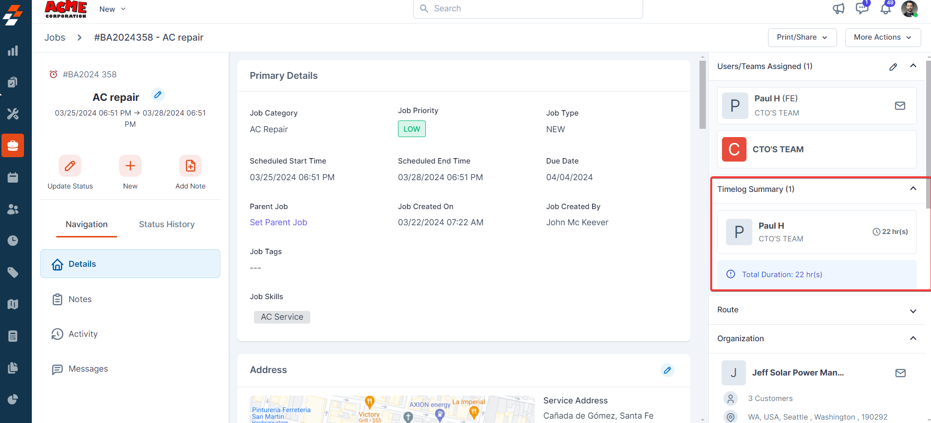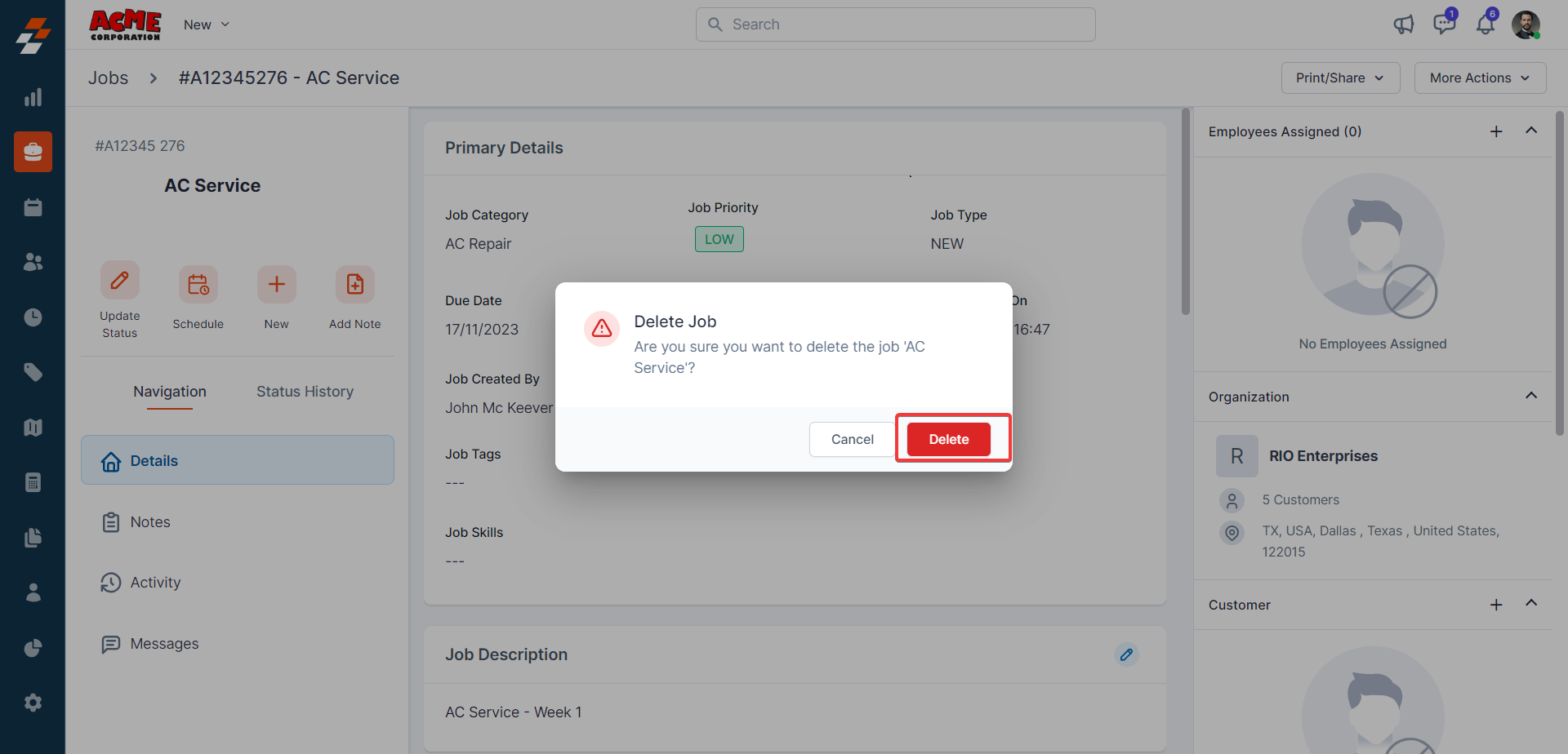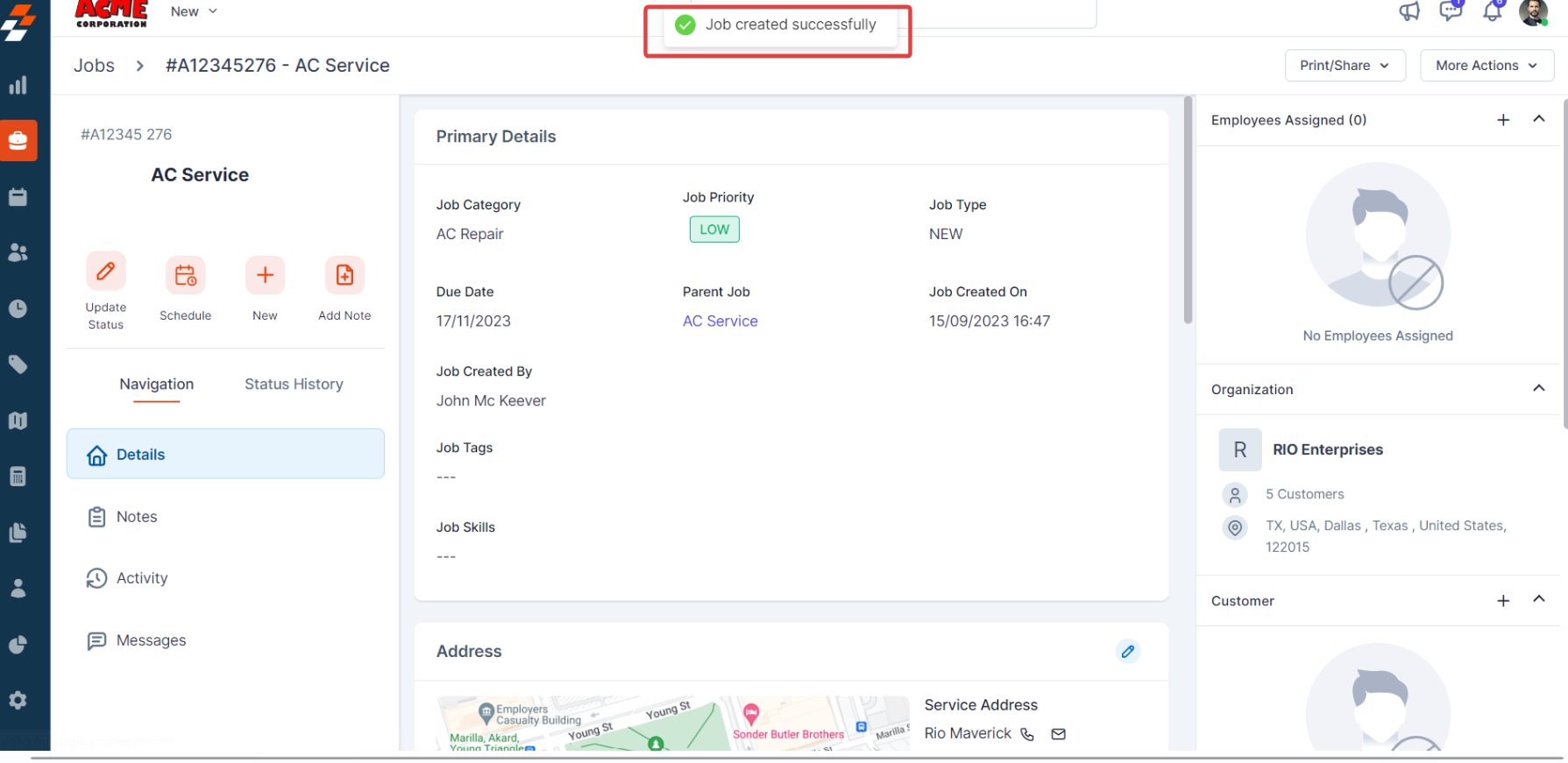 Using the navigation menu, you can navigate to the various sections of the job, including Details, Notes, Activity, and Messages.