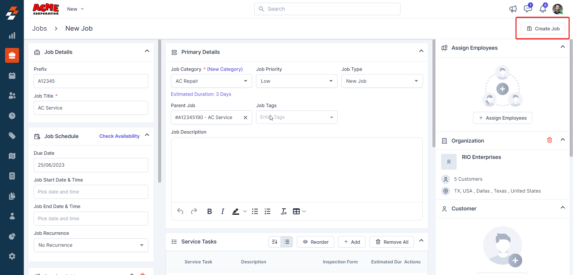 The project details section gives you an overview of all the job-related details. It includes primary information such as job category, priority, scheduled date, and tags associated with the job, along with job service/billing address and other details, which include job-specific custom fields.