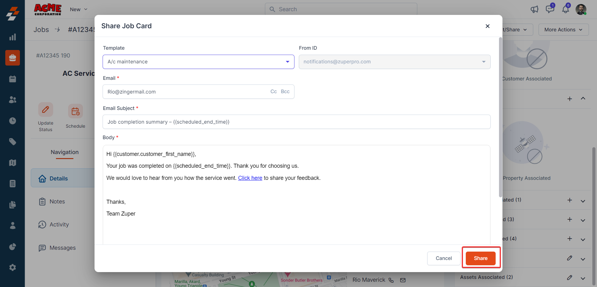 3. Similarly, to share the job card over the mail, click on “Share via email” from dropdown. The email field will be automatically copied from the Service address. You can also use the CC & BCC to add any additional recipients to the email. Click the "Share" button to share the job card via email.