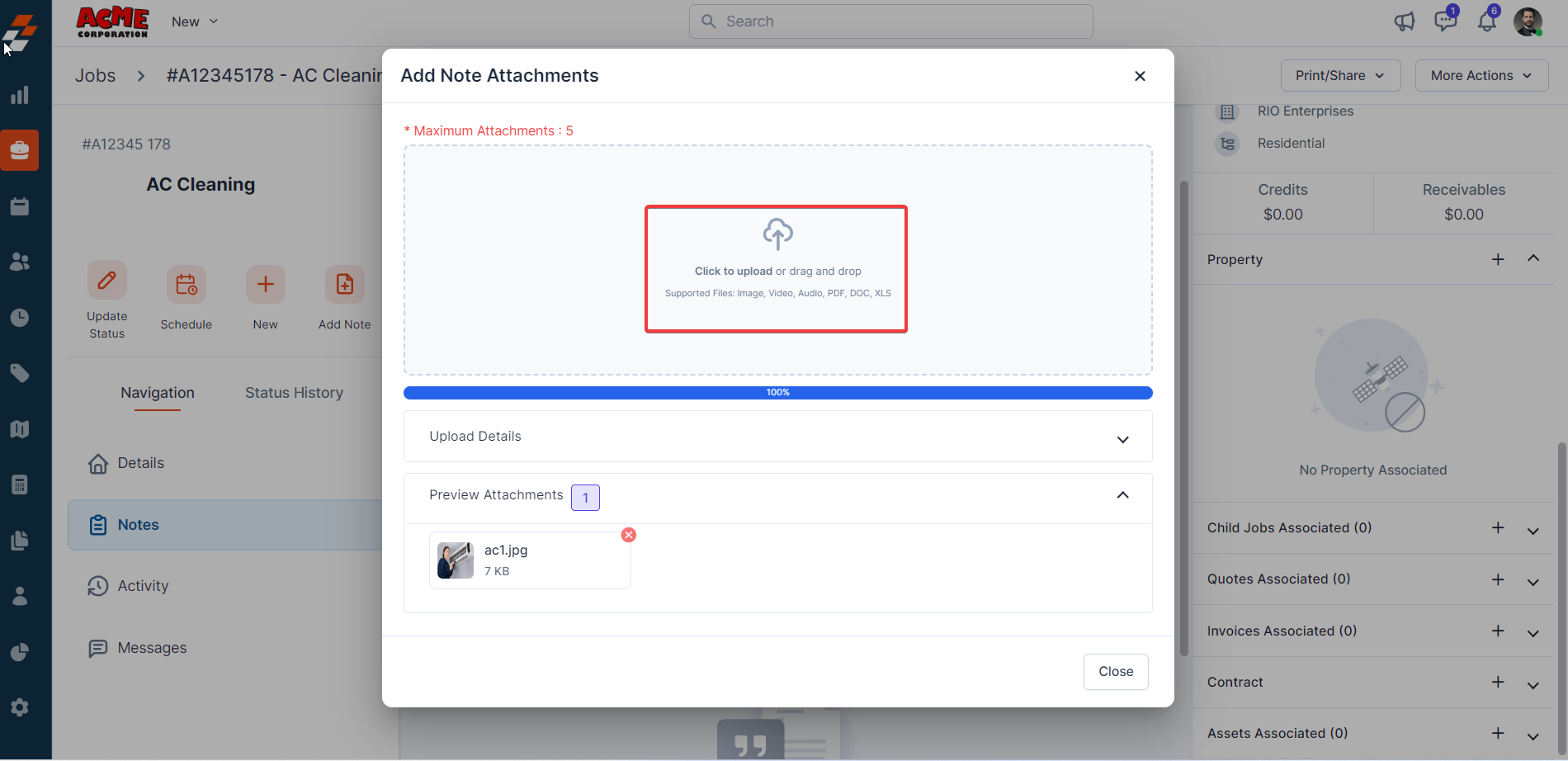 Job notes are comments or information that are added to a job over its course. These job notes add more context to the job. Your notes can be anything ranging from a simple text reminder to an image of the item service and video or document. All added notes can be viewed under the Notes Section in the middle pane of the Job Details Page.