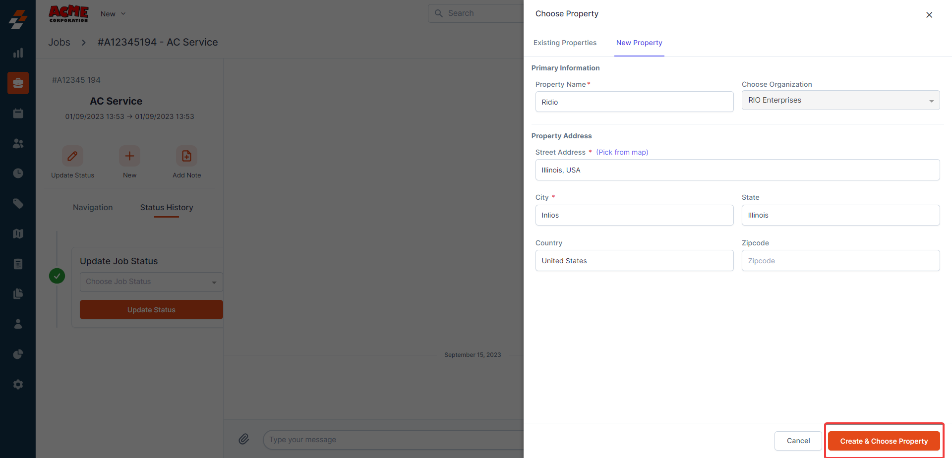 1. You can associate a property to the job - either a new or existing property.