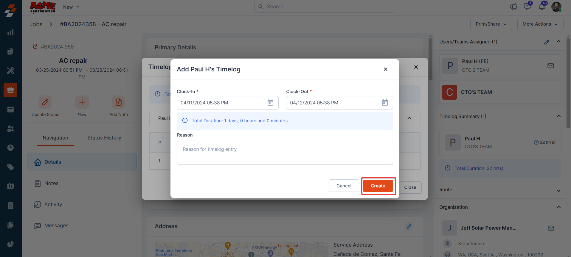 Time picker. Click the “Create” button to add the time log entry.