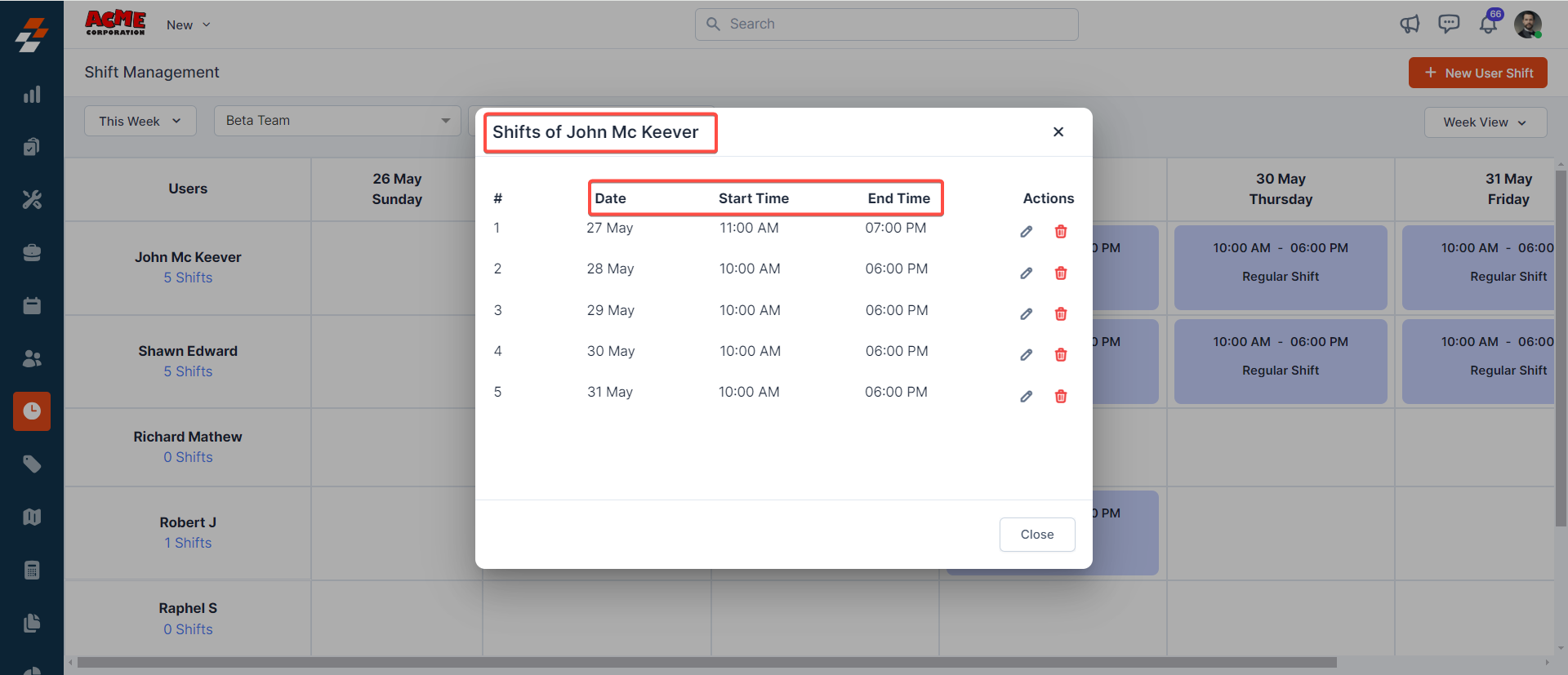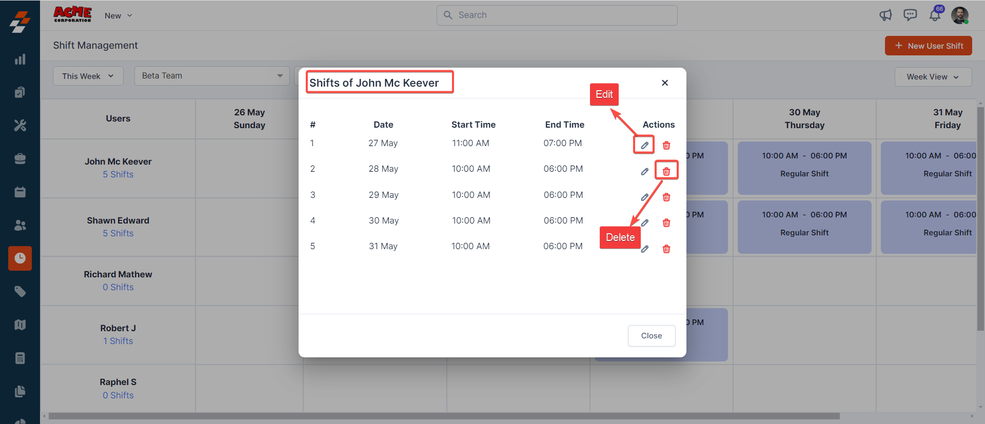 3. You can view their scheduled shifts, including dates and times. Select the shift and choose to edit or delete using the edit and delete icons under the Action column.
