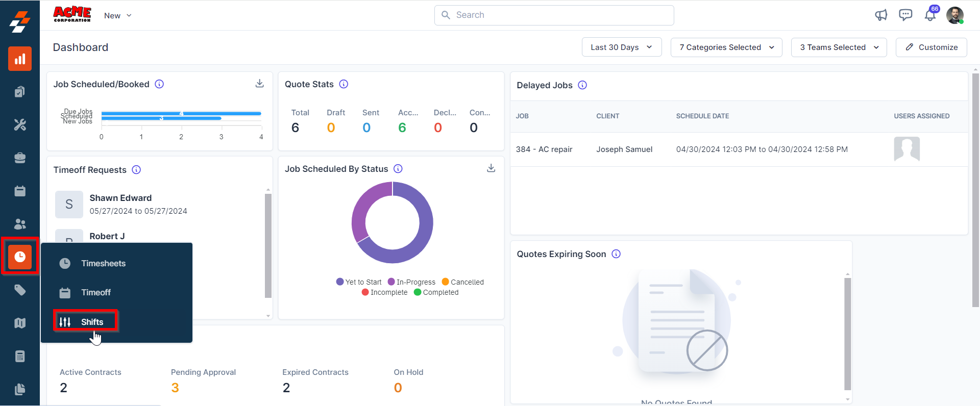1. Click the "Timesheets" module from the left navigation menu and select “Shifts.”