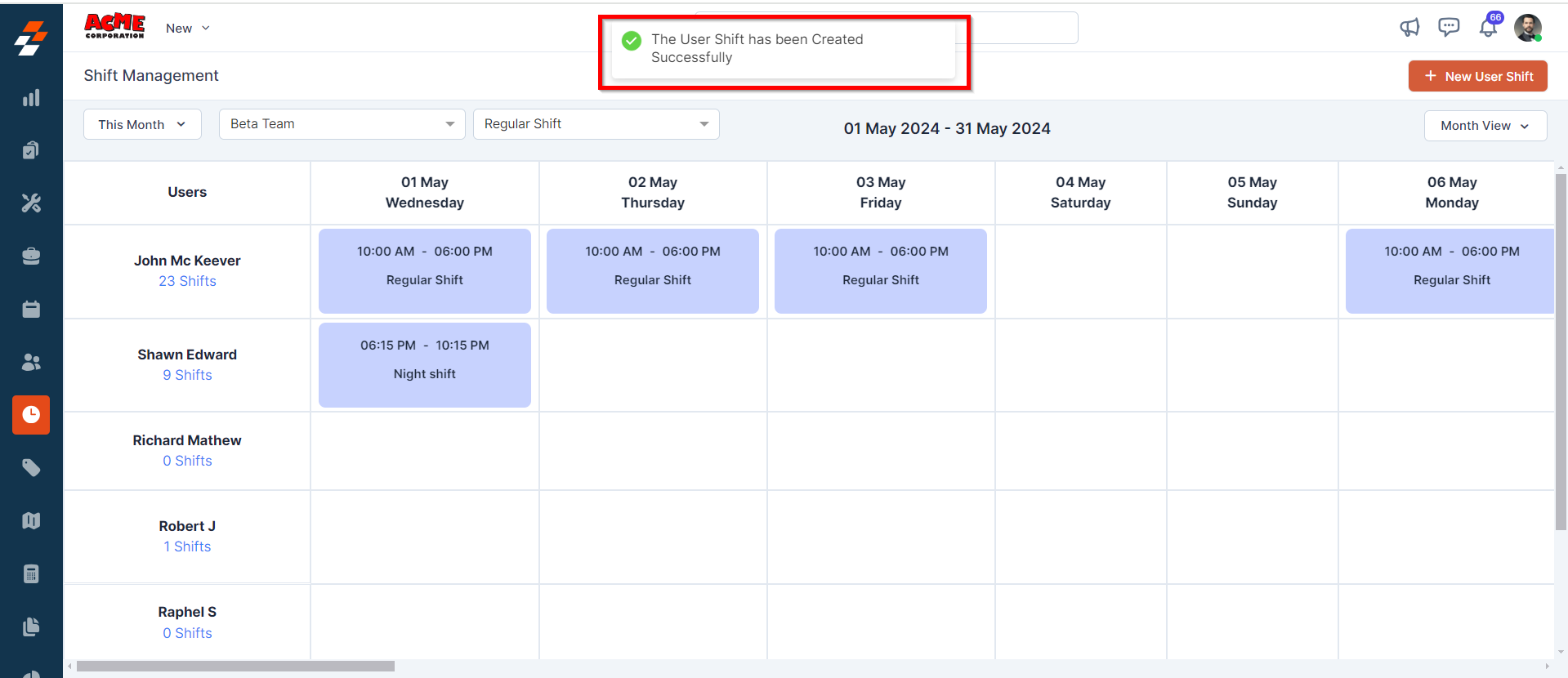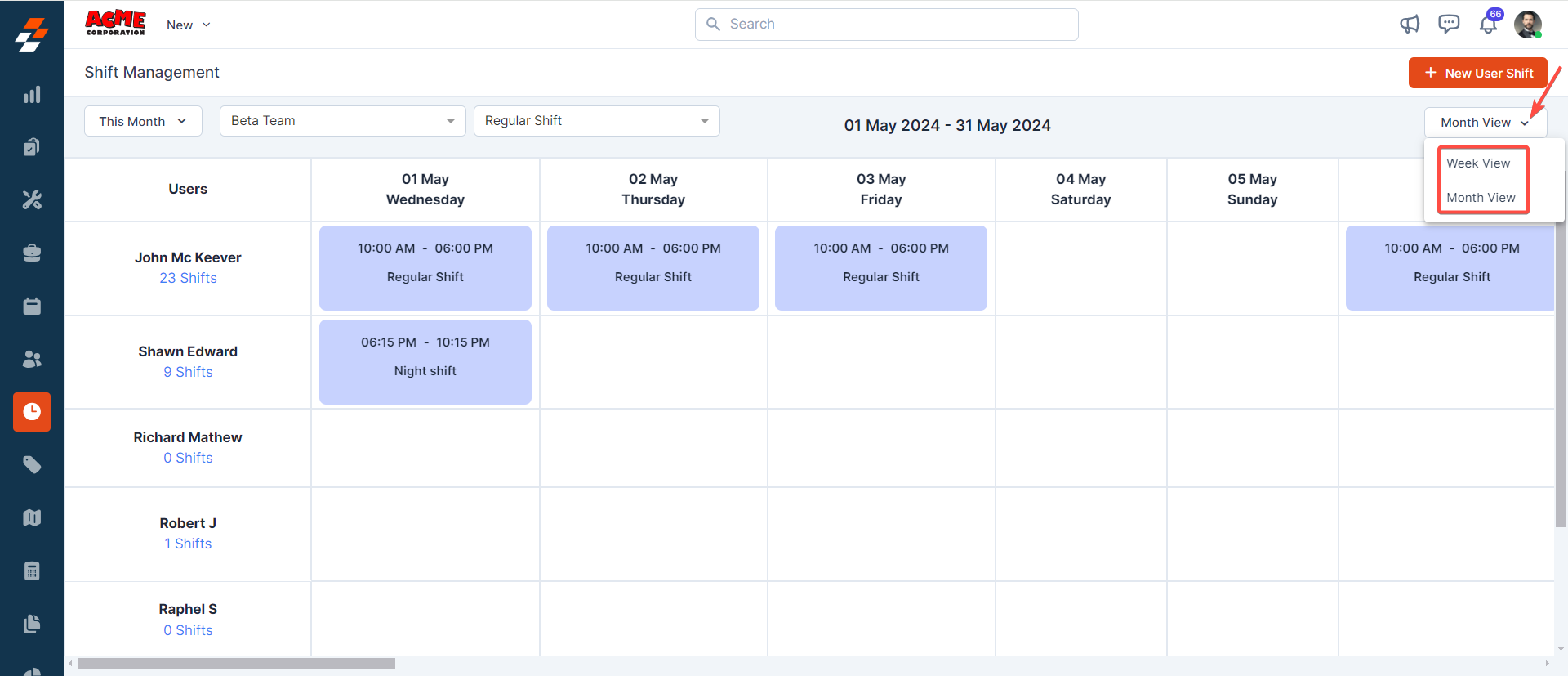 - Month View: Provides an overview of all users' shifts within a specific month, giving you a broad perspective on scheduling.