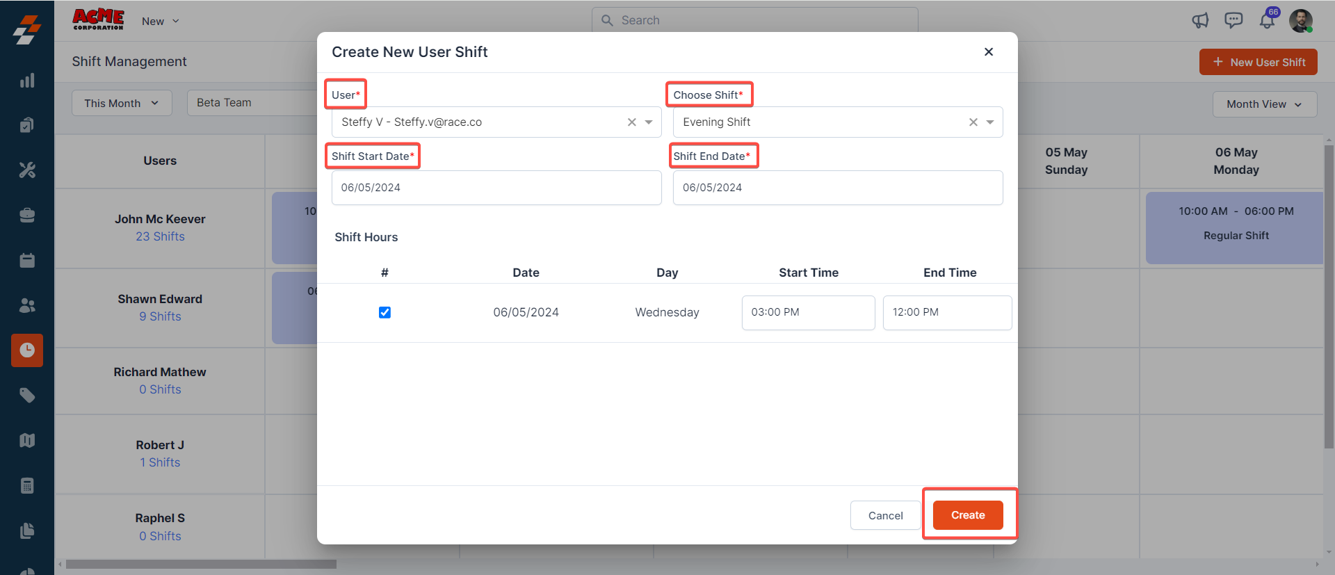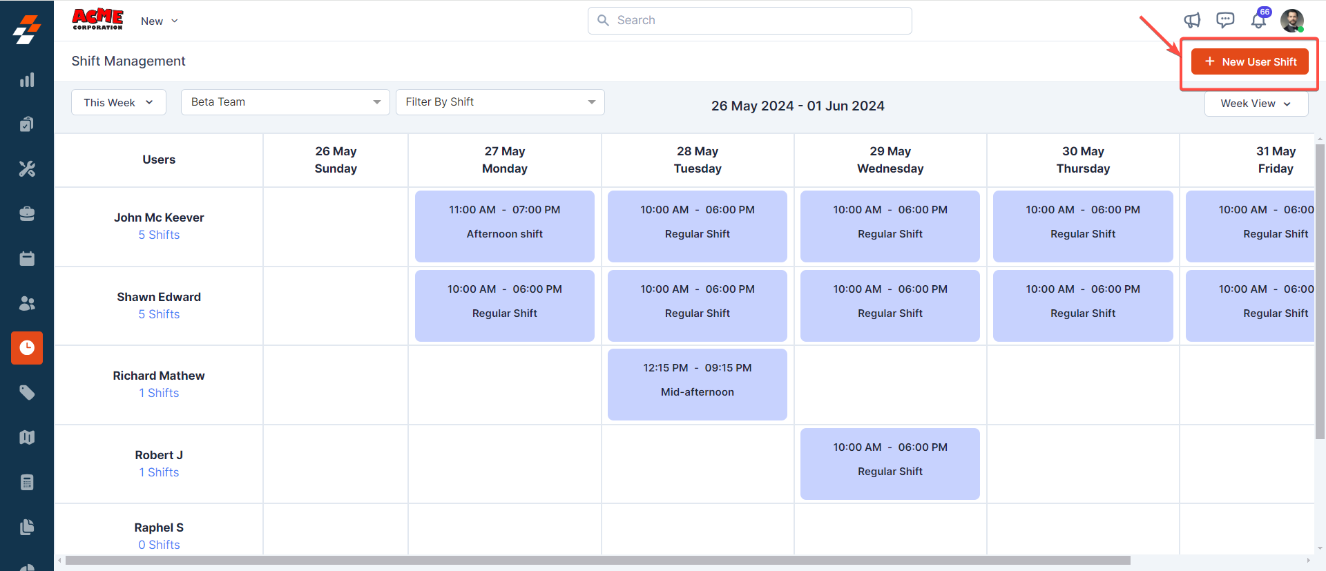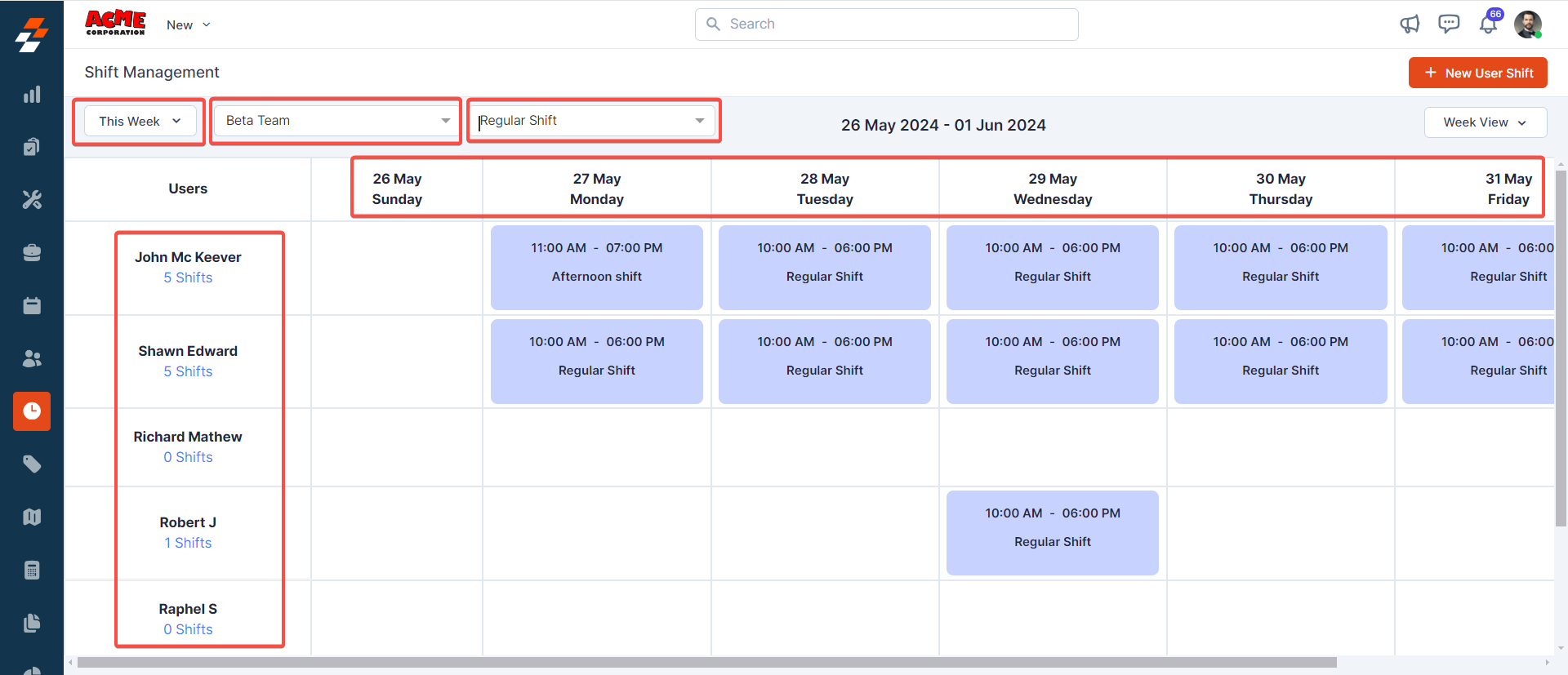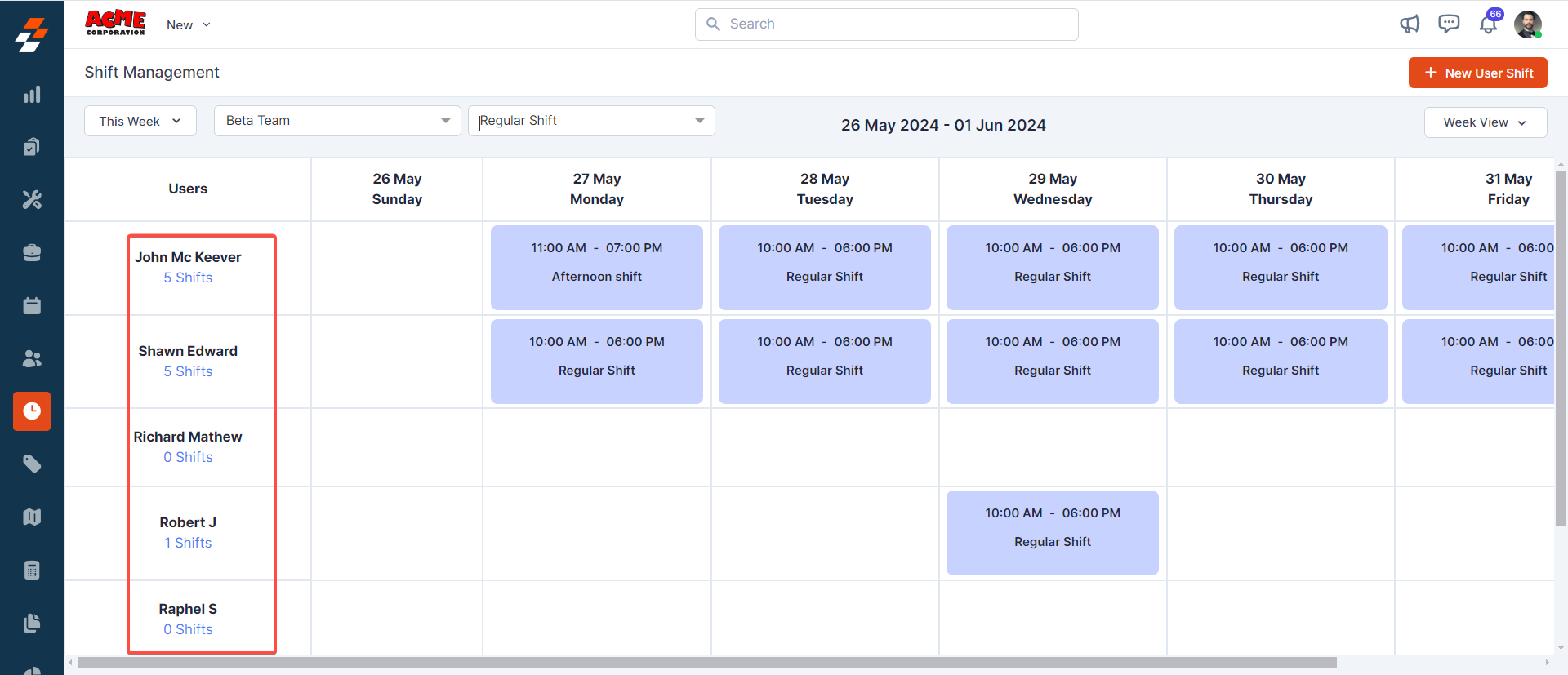 2. You can view all the users and their shifts based on the team, date range, and filter applied.