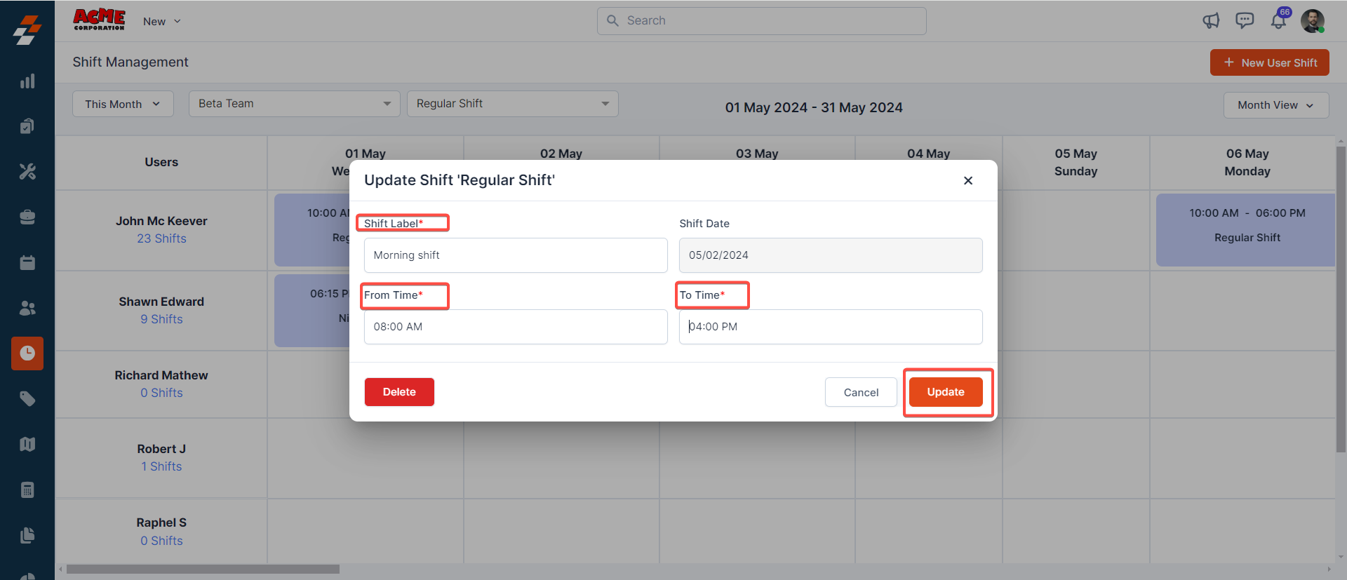 Note: You can only edit the shift label and time period, not the date. You can also delete the user shift from here by clicking the Delete button.