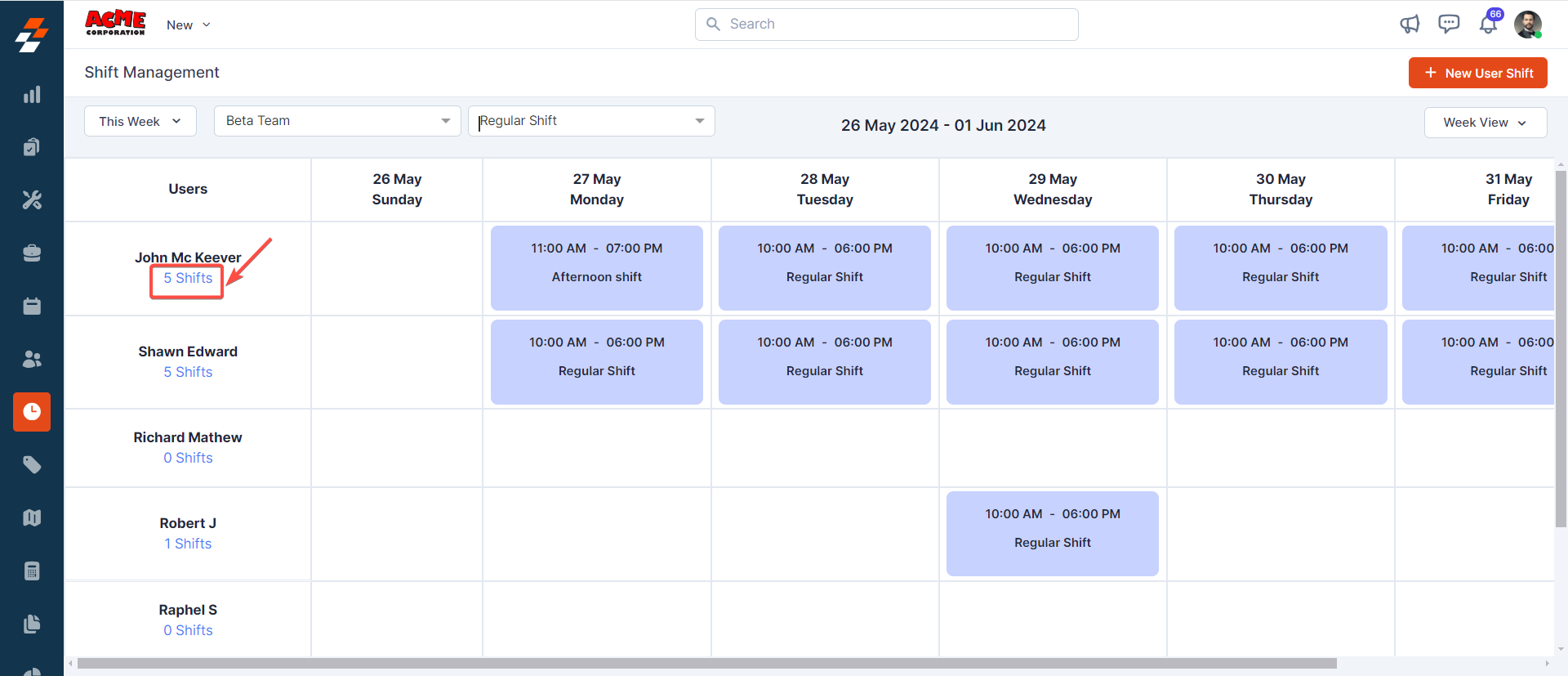 1. After landing on the shifts page, you can view the users and the number of shifts on the left.
