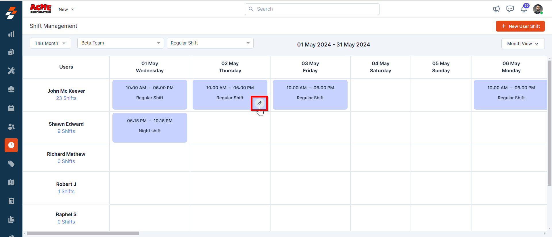 2. Hover over the user shift you wish to edit, where you’ll see a pencil icon. Click on the "pencil icon" to edit the shift details.
