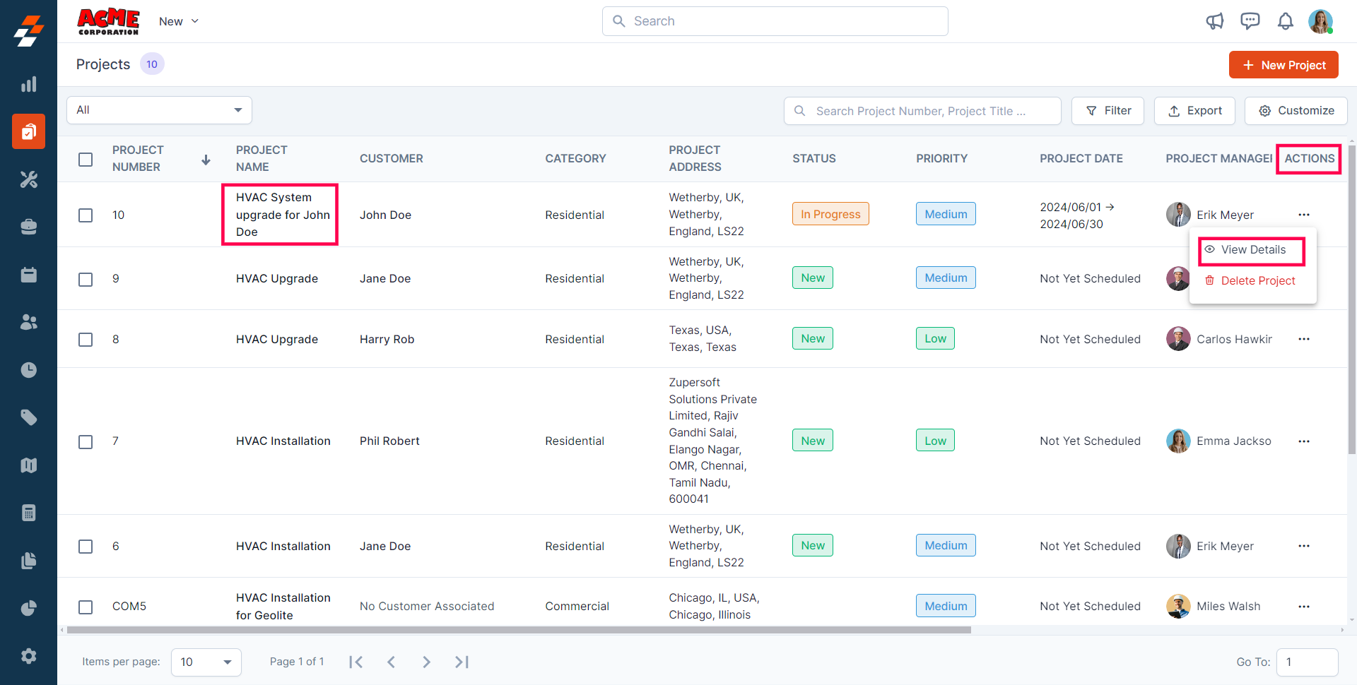 You can delete or view any of the project details. To do so, click the "ellipsis" icon under Actions and choose "View Details" or "Delete Project" as needed.