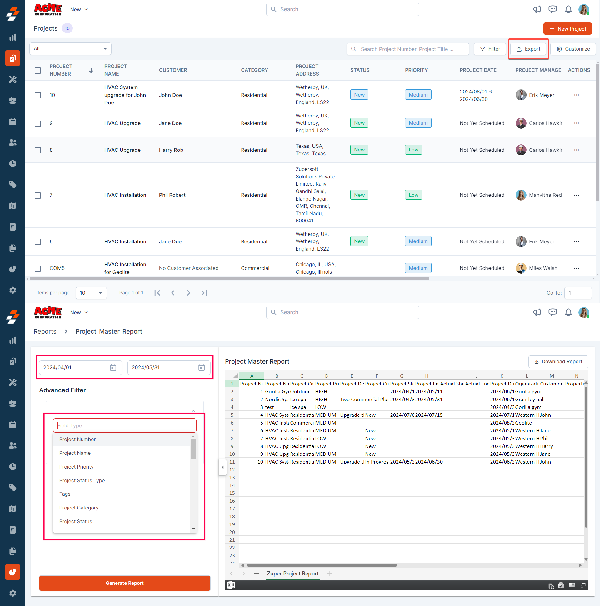 You can preview and download the Project Master Report as an Excel file. To do so, click the "Export" button at the top right, select the start and end date, and click the "Generate Report" button.