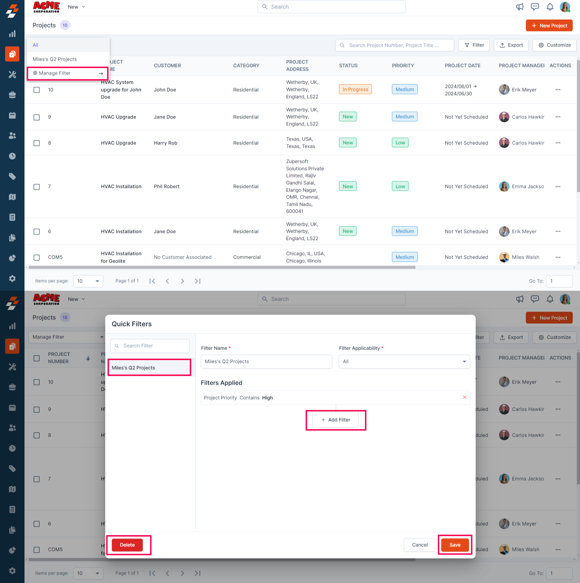 9. To access and manage quick filters you added, click the dropdown menu in the quick filter at the top left corner and select 'Manage Filter' option. This allows you to view and add/delete filters as needed.