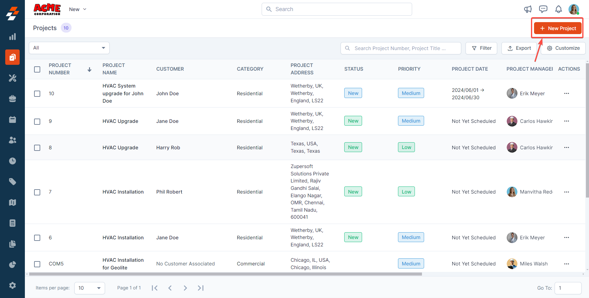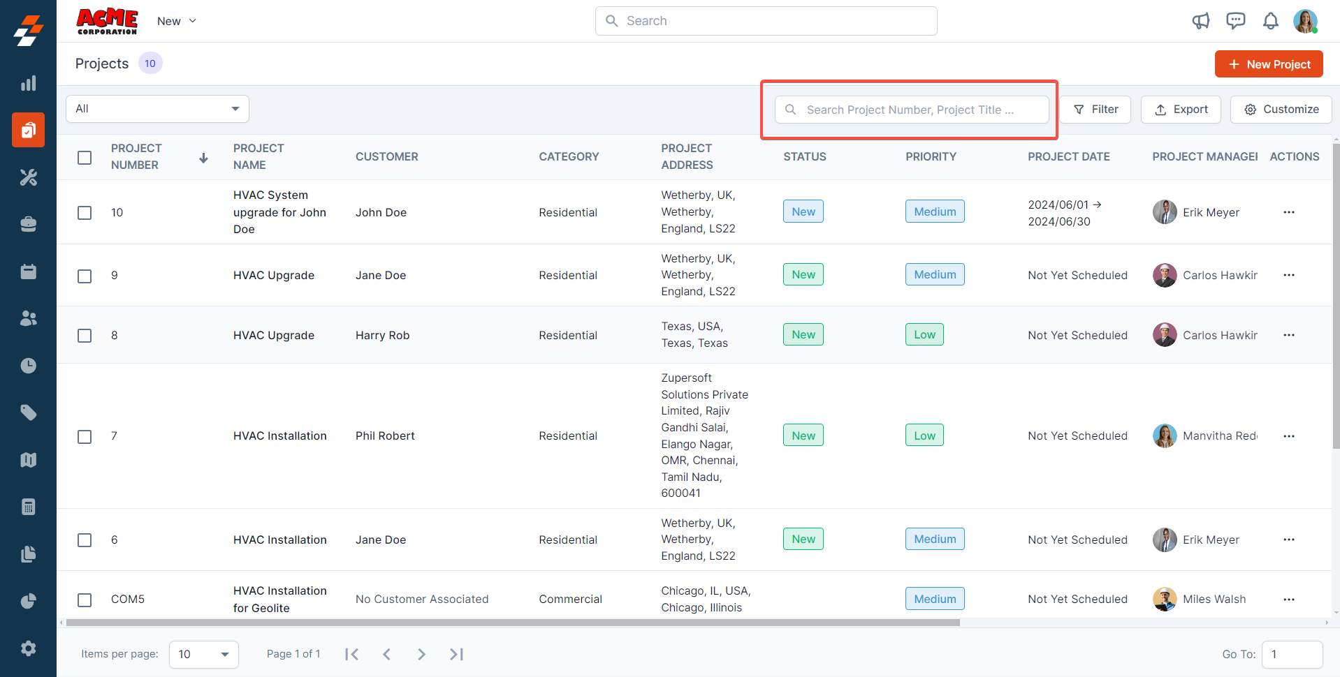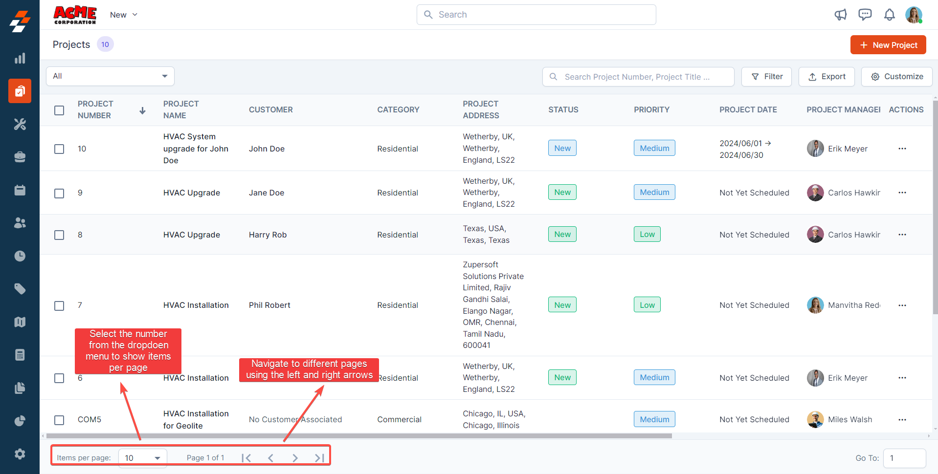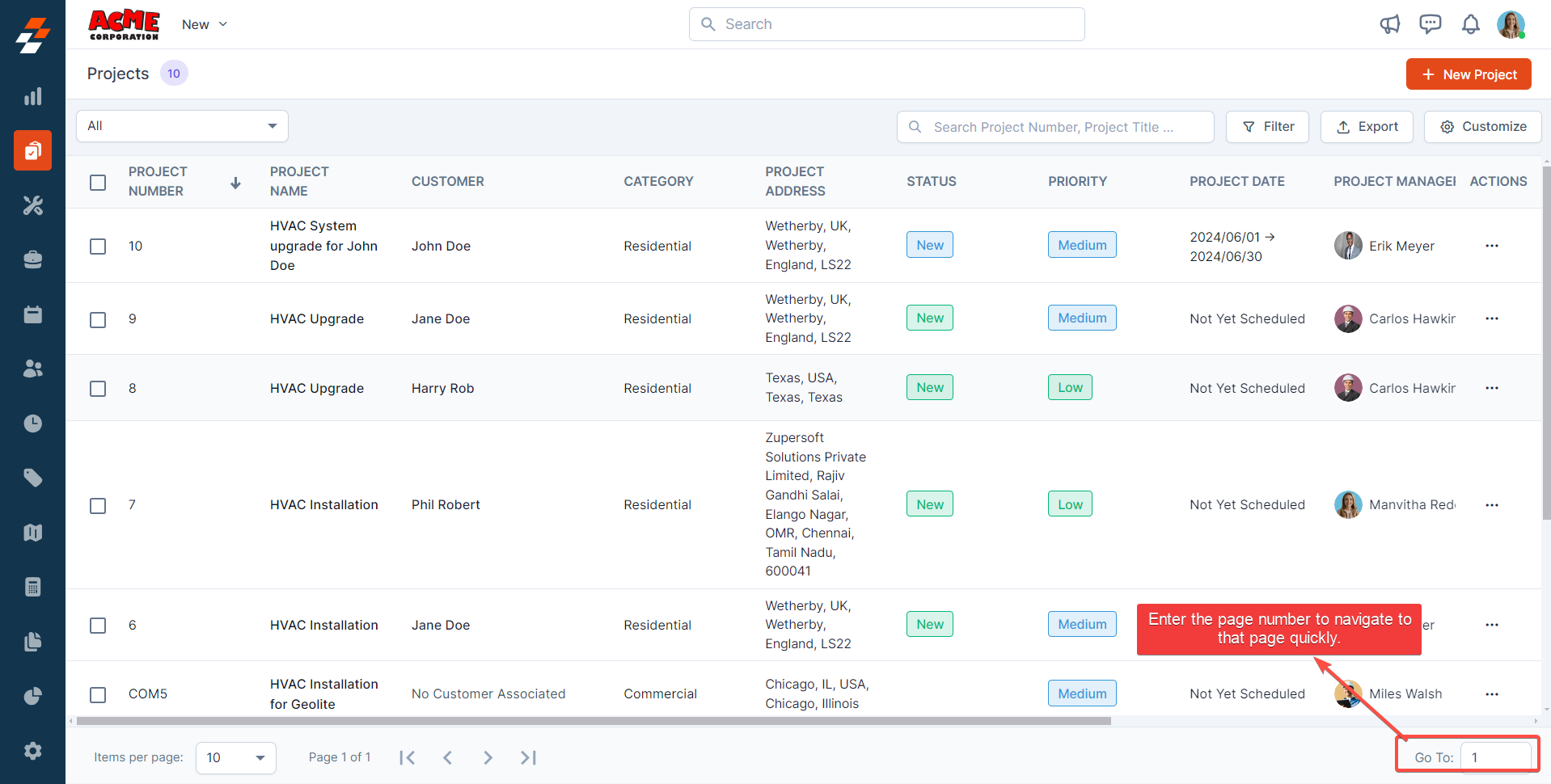 1. Click the "Projects" icon in the left navigation menu. You can view the list of projects with columns such as project name, customer, category, project address, status and so on.