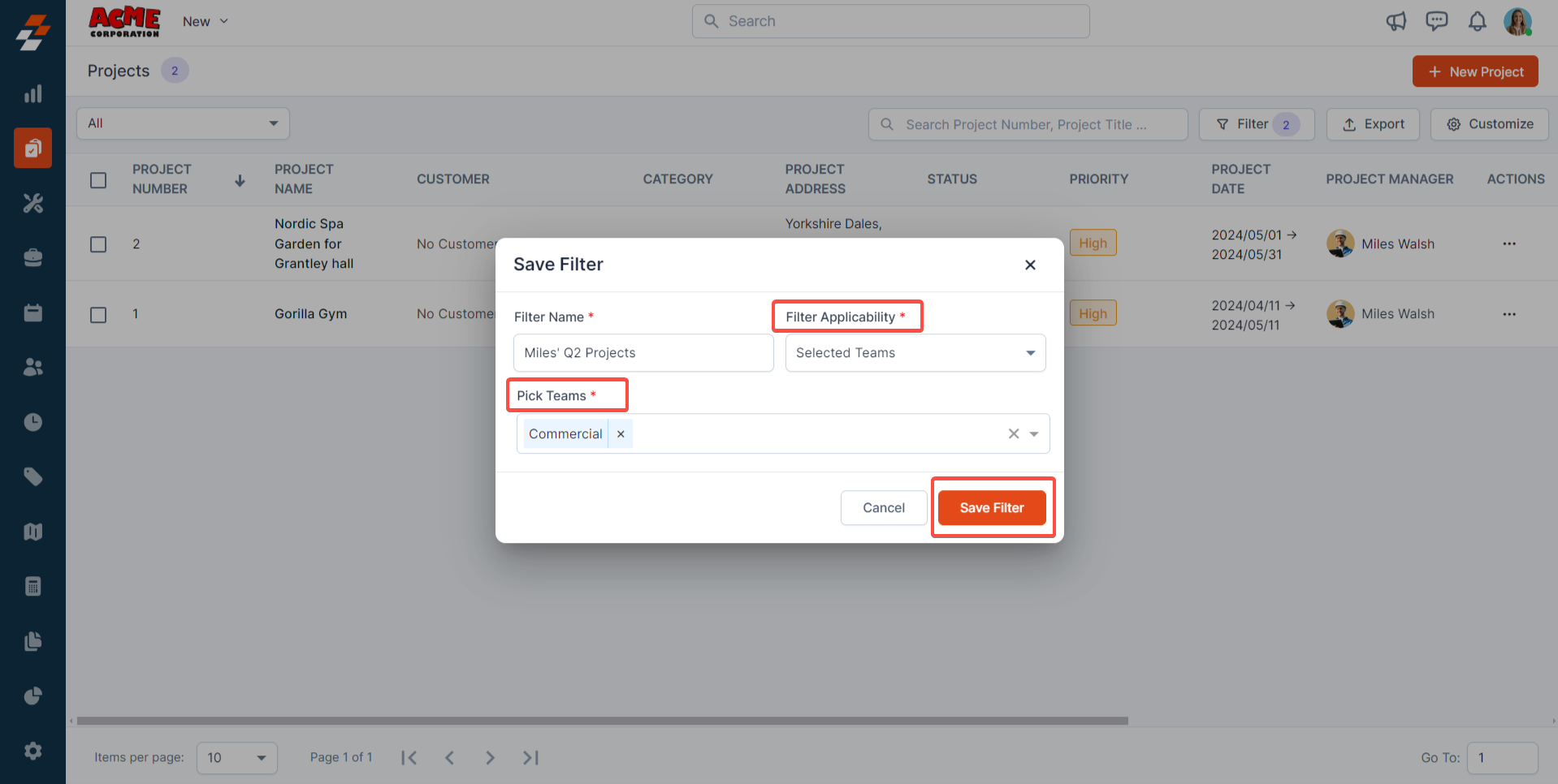 7. If you choose the filter applicability as selected teams or users, enter the team name or names in the box below. Once done, click the "Save Filter" button.