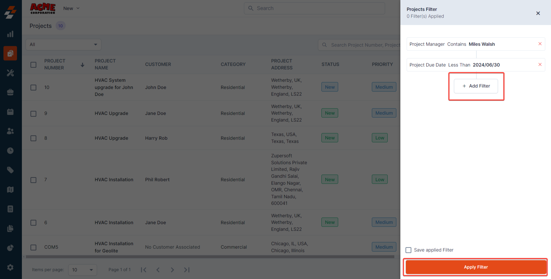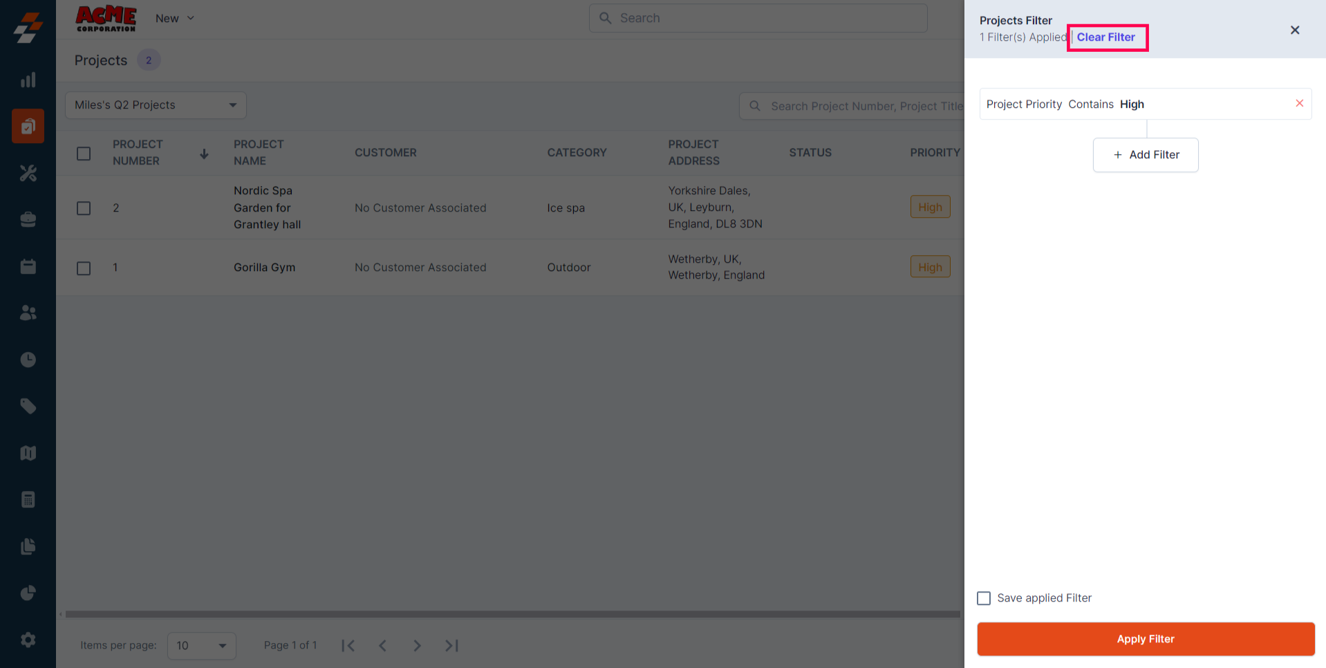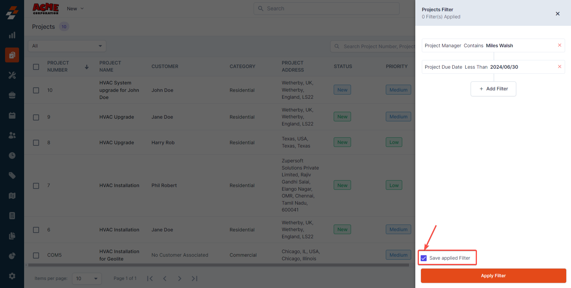 5. You can also save the applied filter, which will be added to the quick filters section at the top left corner. To do so, check the "Save applied filter" checkbox.