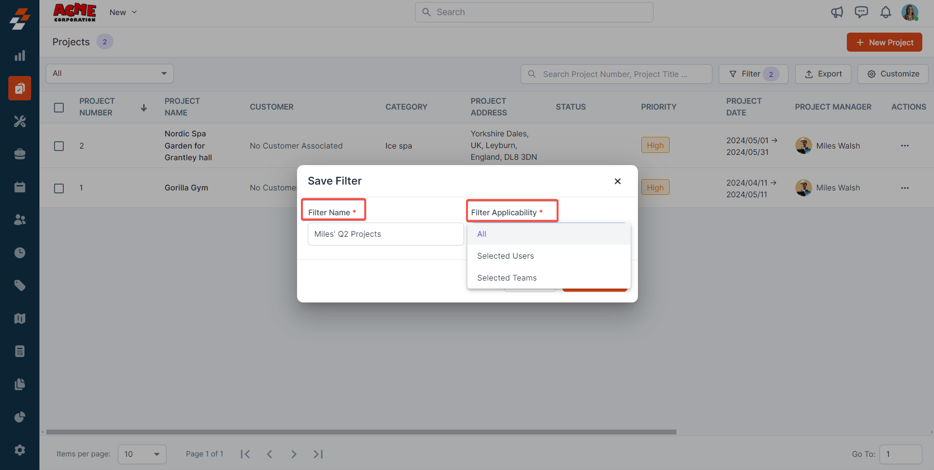 6. Enter the "Filter Name" and "Filter Applicability" in the pop-up.