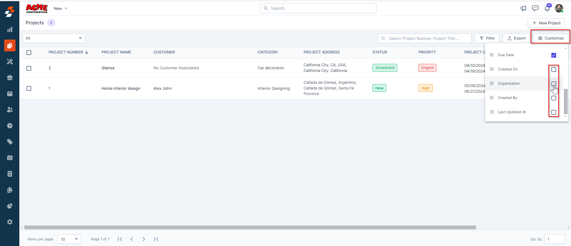 You can add, remove, or reorder the columns as needed. To do so, click the “Customize” button at the top right corner and check or uncheck the checkbox next to a field to add or remove them.
