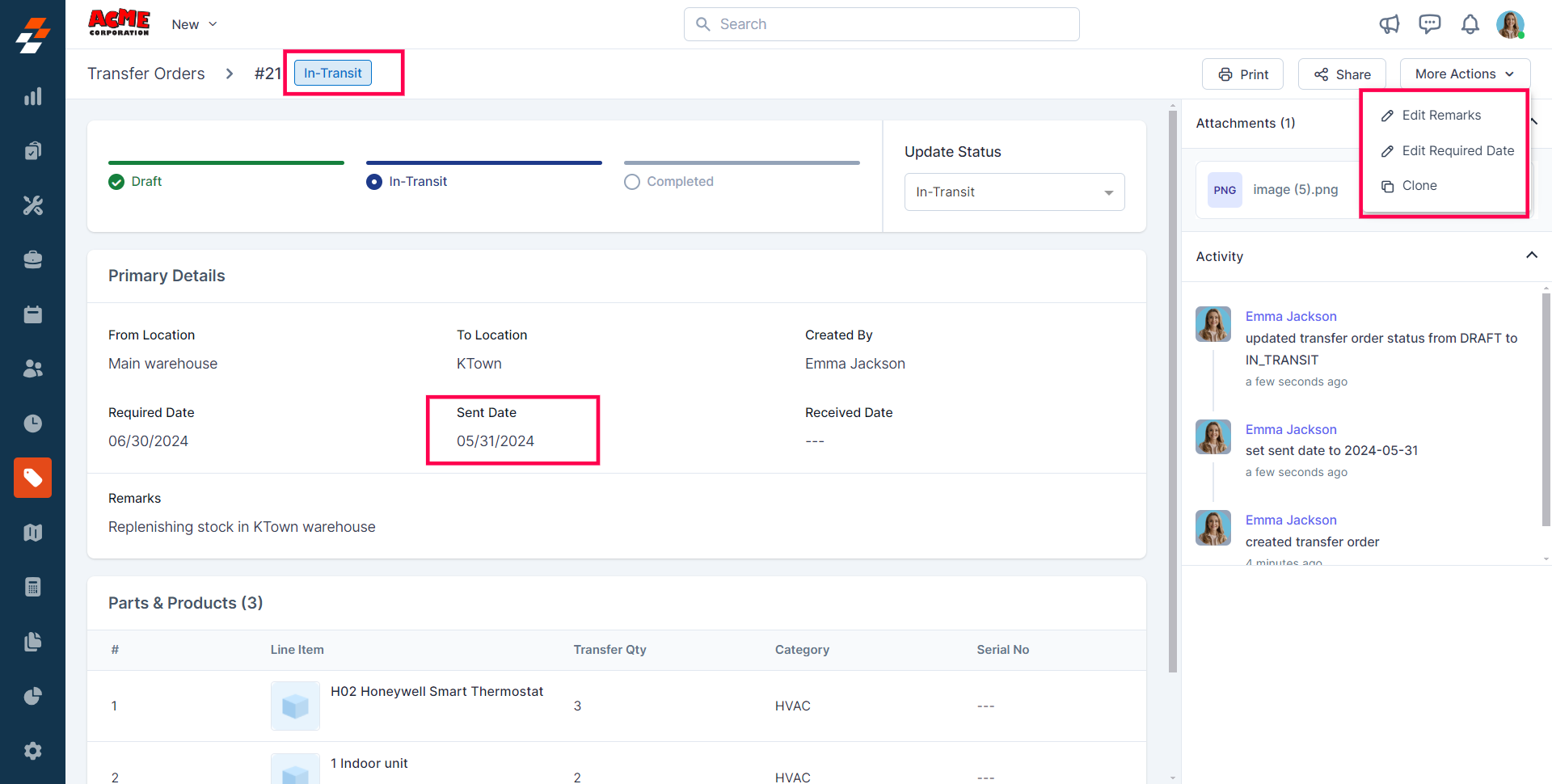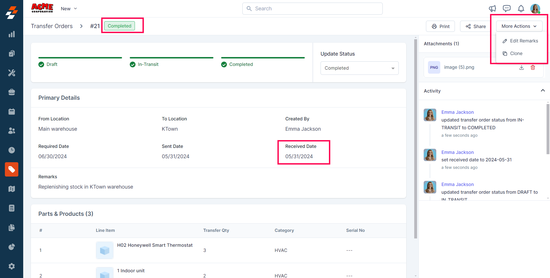 Note: During the In-Transit status, you cannot edit or delete the Transfer Order created but can perform various actions such as “Edit Remarks,” “Edit Required Date,” and “Clone” by clicking the “More Actions” button at the top right as shown below: 3. Completed