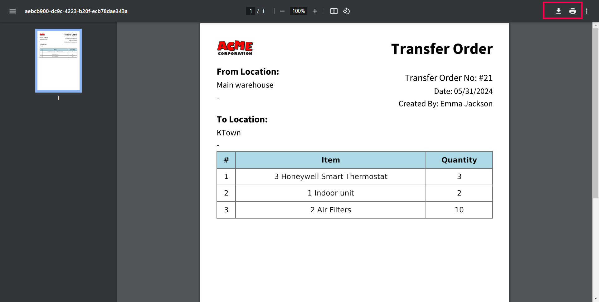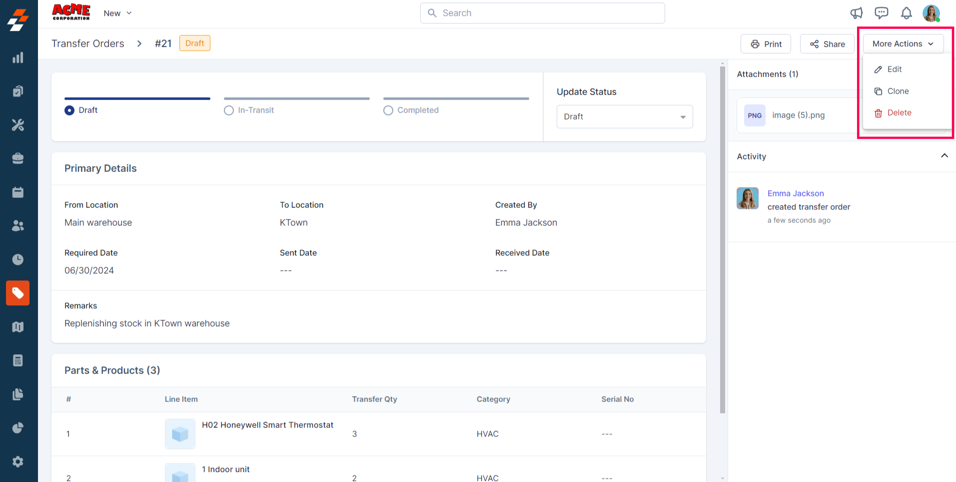 Note: During this status, you can also “Edit,” “Clone,” or “Delete” the transfer order as needed by clicking the “More Actions” button at the top right as shown below: