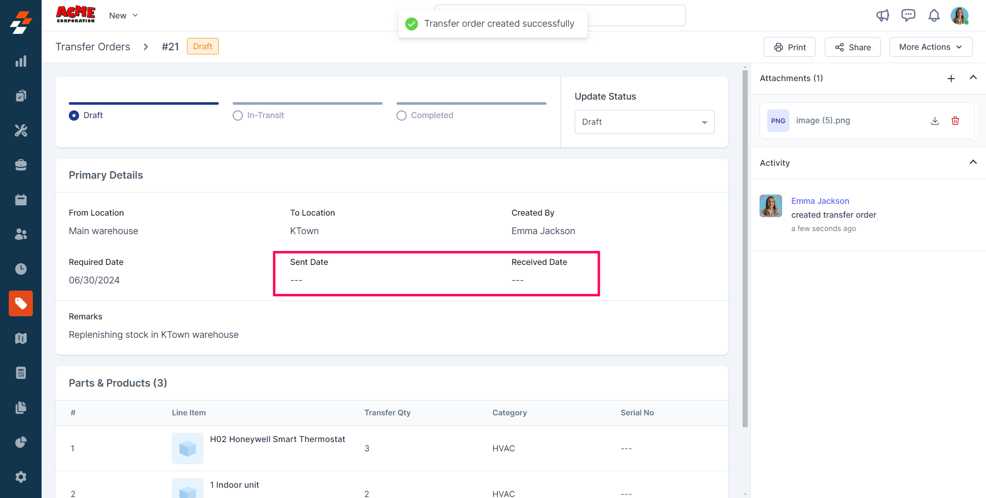 Once a Transfer Order is marked as completed, the transferred quantity is increased in the To Location for each of the line items. If the transfer is completed instantly (i.e; it is marked as completed during creation or from draft status), the sent date will be the same as the received date and the line-item quantity and serial numbers will be updated in both the From and To Locations.