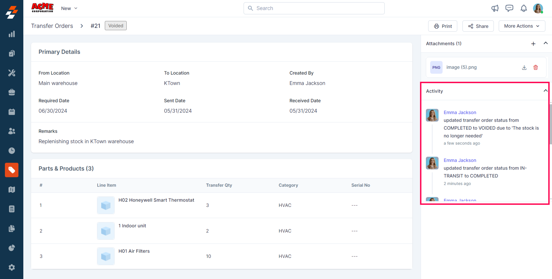 If you need to cancel or invalidate any of the Transfer Orders, you can choose to mark it as void. This action will reverse the quantity transferred between locations.