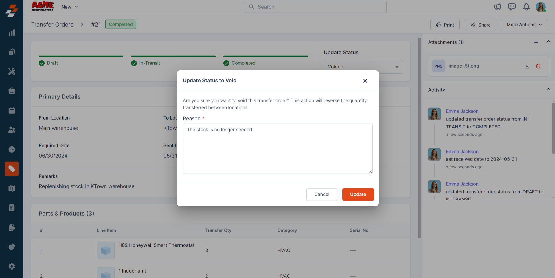 Once an order is marked as void, you will be prompted to provide a reason. After providing the reason, click the “Update” button to void the Transfer Order successfully. The provided reason is captured under activity.