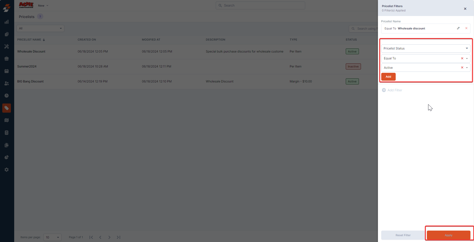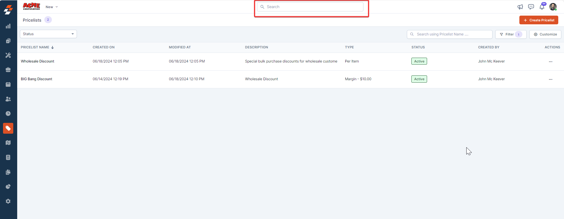 Use the Search bar to search for a specific pricelist by name from the listing page.