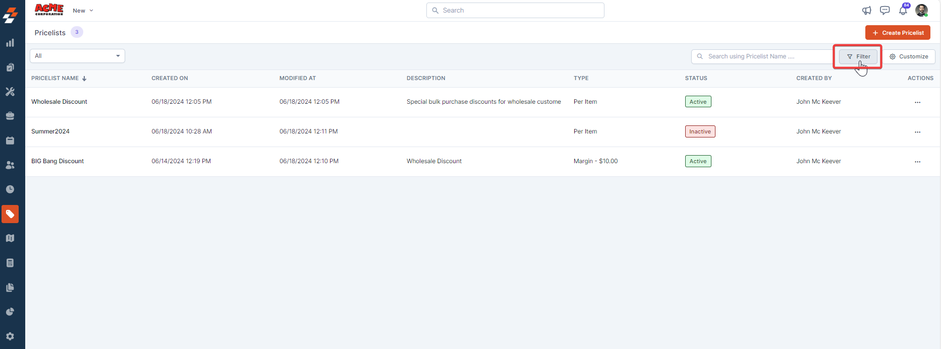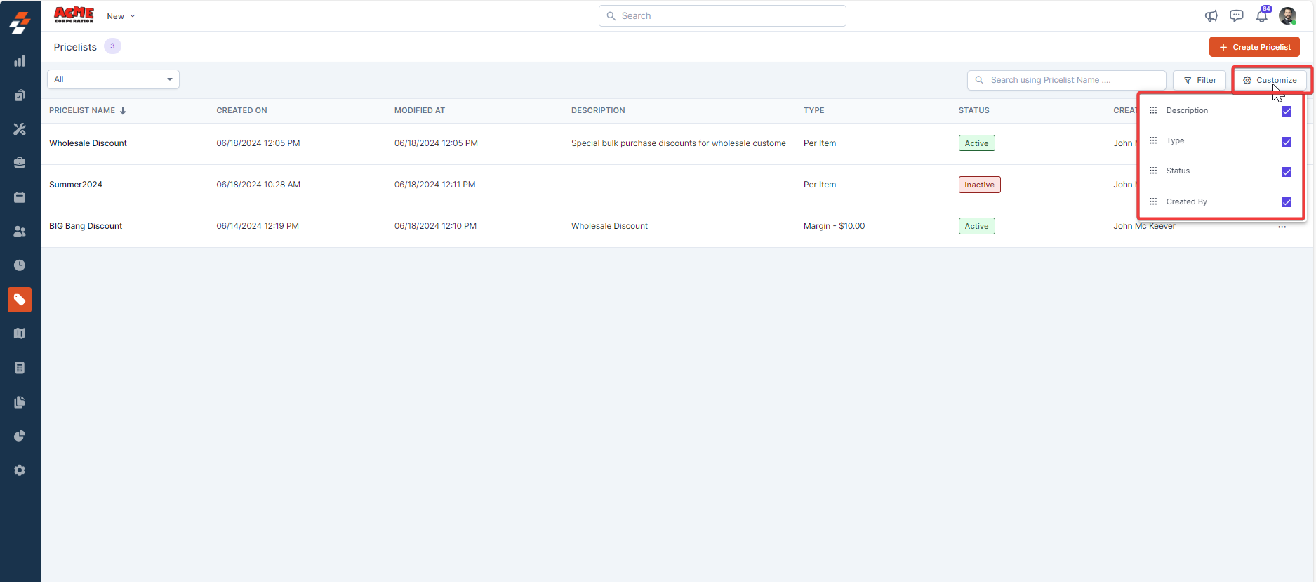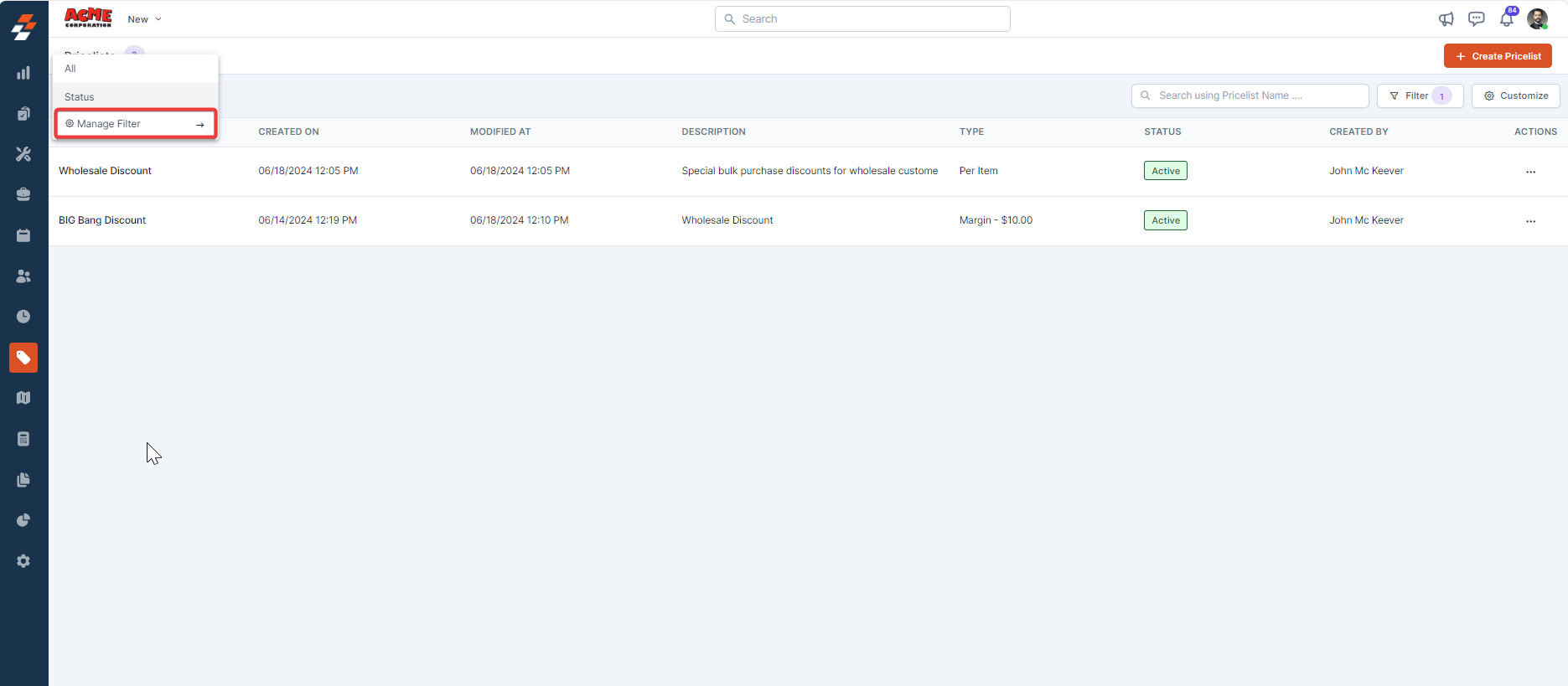 Pricelists listing page displays all the created pricelists with details such as the pricelist name, description, type, status, created date, modified date, created by, and associated customers.
