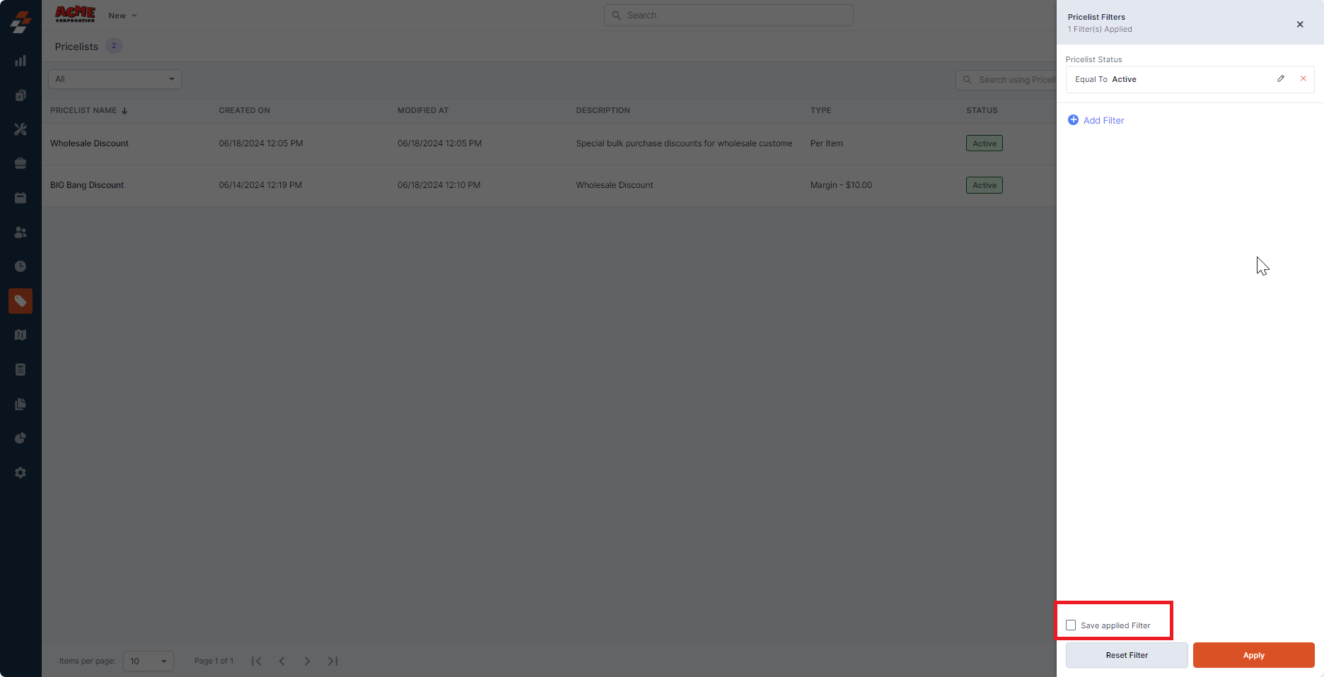 You can also save the applied filter, which will be added to the quick filters section at the top left corner. To do so, check the "Save applied Filter" checkbox.