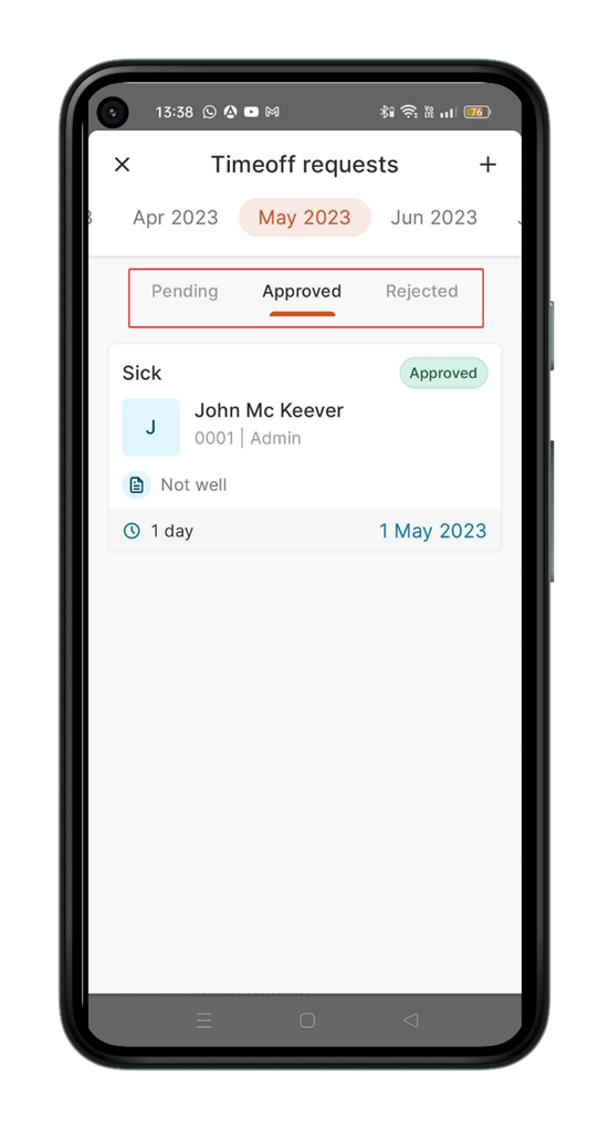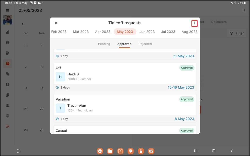 4. To add new time off request, click the “+” icon at the top right corner of the screen. A dialog box appears.