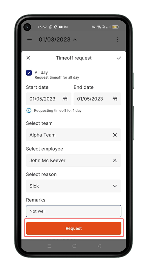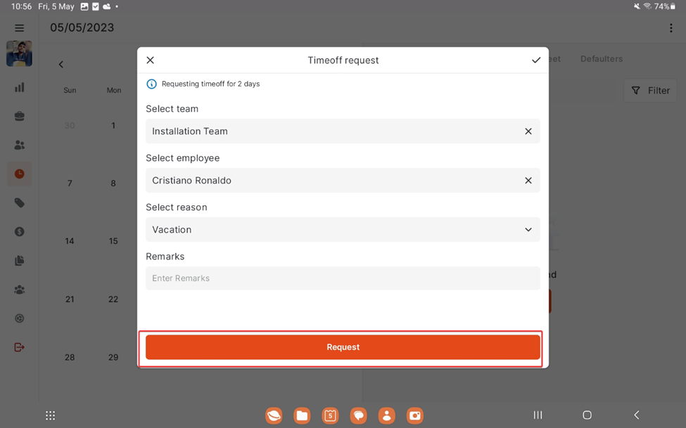 5. Fill in the “Timeoff Request” details and click the “Request” button. The time off request will be created successfully for the month.