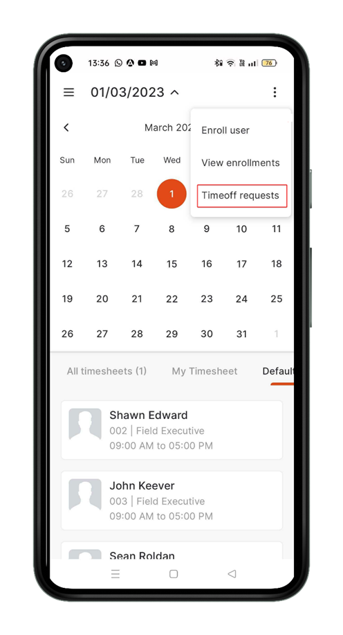 3. To view the timeoff requests submitted by the employees, click the "Kebab" icon at the top right corner of the screen and select "Timeoff requests"