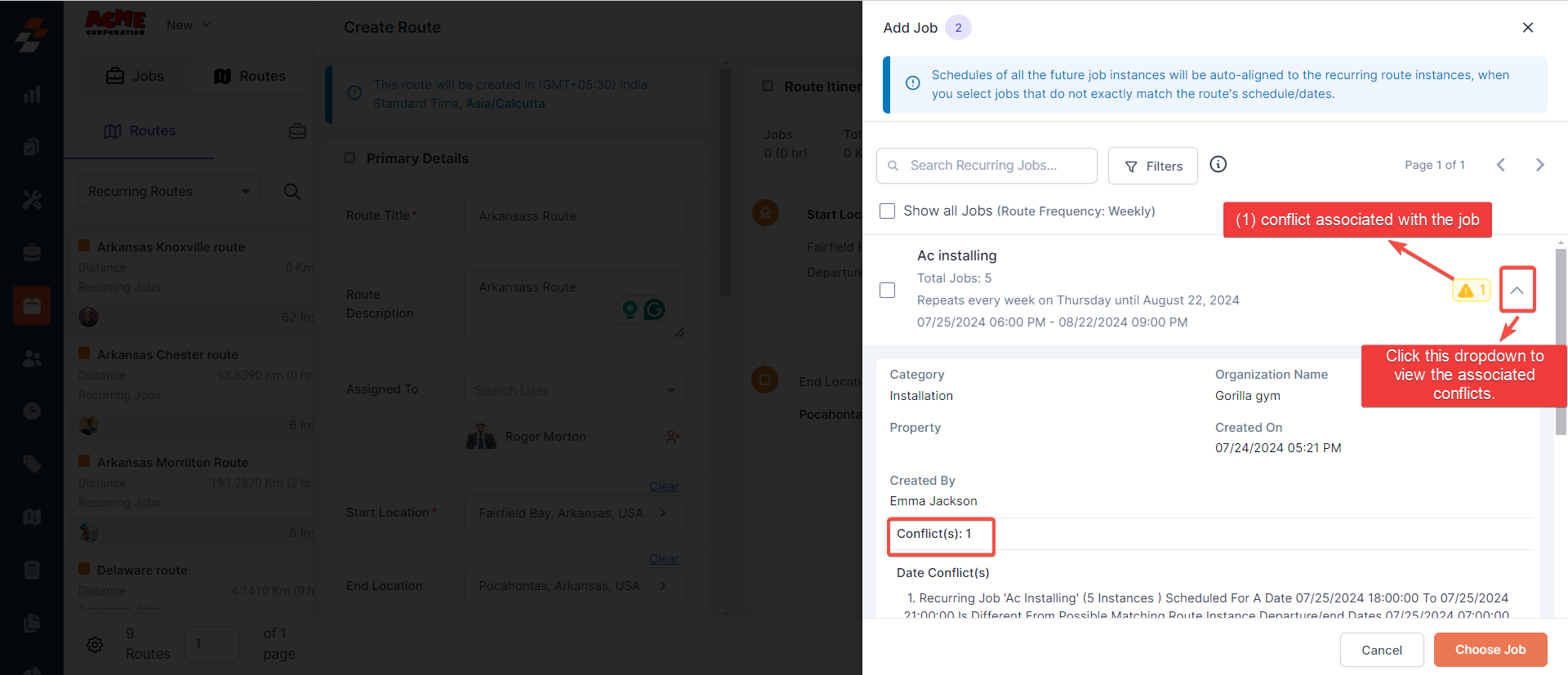 For example, if a recurring route is scheduled every Tuesday, but a job meant for this route recurs every alternate Tuesday, this conflict will occur.