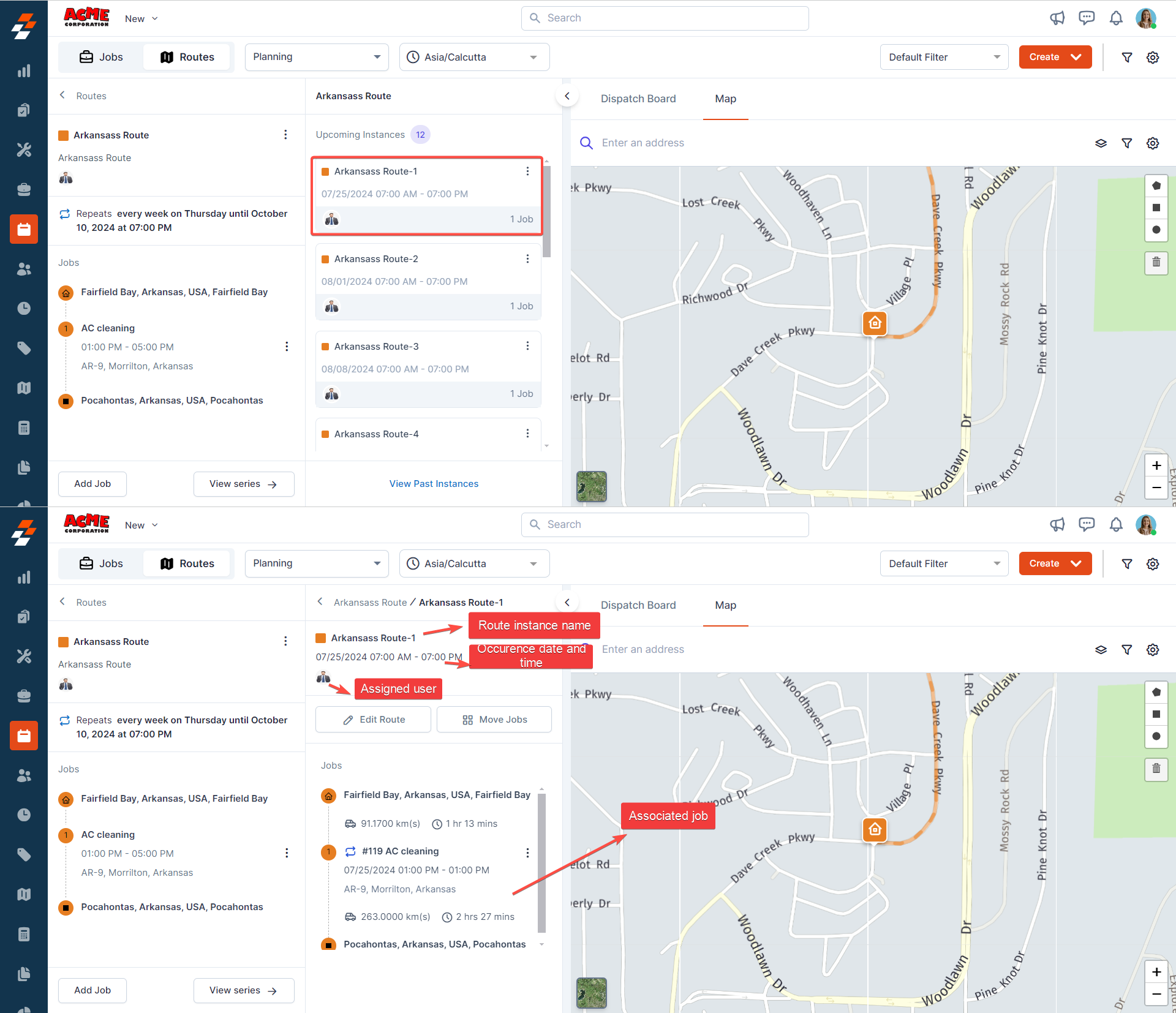 From the above image, you can see that the first job instance within a recurring job series is associated with the start of the route instance. Subsequently, based on the job frequency, it continues to associate with the route instances accordingly.