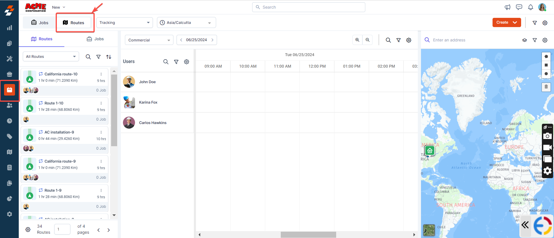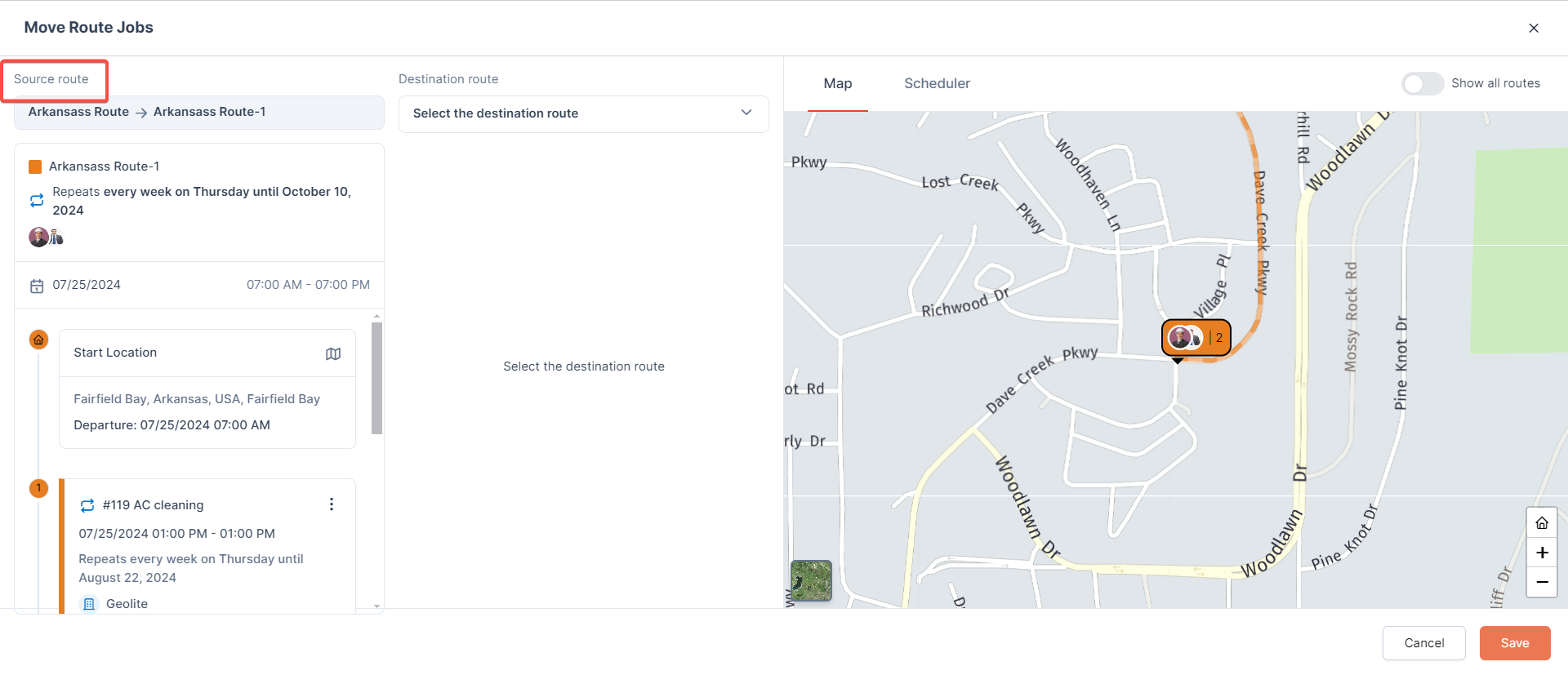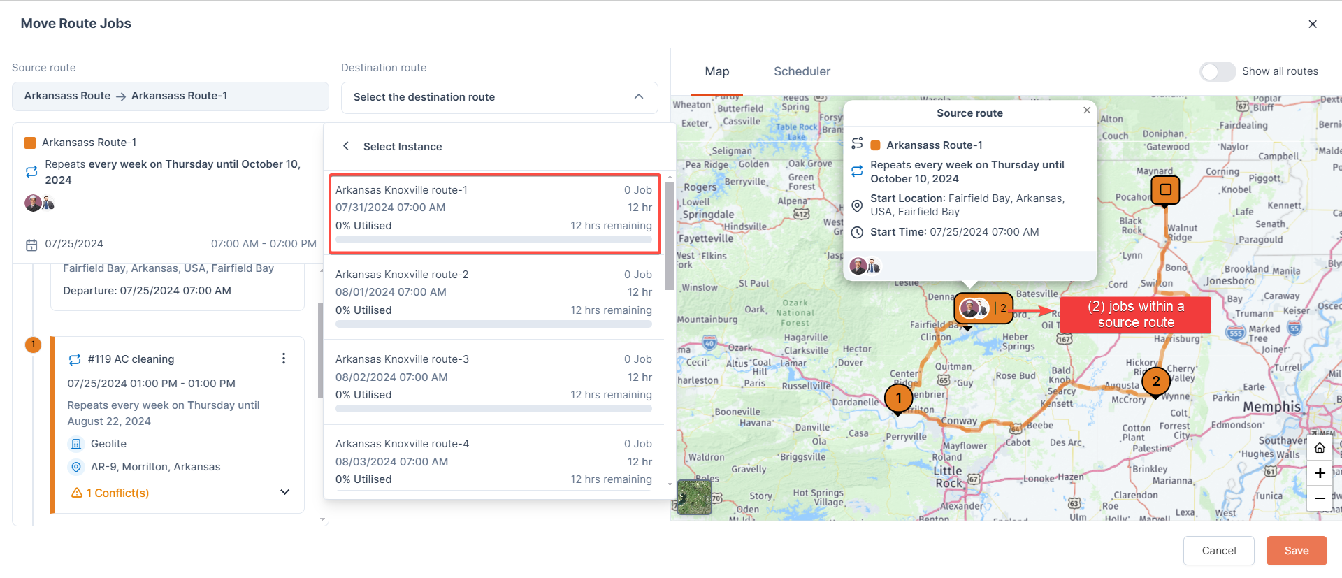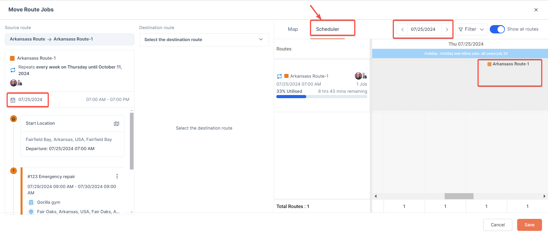 If you need to move a route job to another route based on the customer's preferred date and time, the “Scheduler” view is your best choice. Here, you can simultaneously view both the technician availability and capacity of each route on a selected date. Based on this data, you can choose the destination route. Here's how: