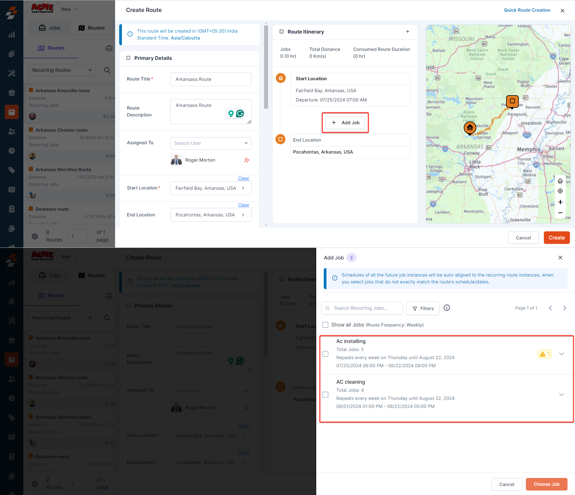 Once the recurring route series is created, you can add an eligible recurring job series containing multiple job instances and assign it to a technician. This allows the assigned technician to efficiently manage their schedule and ensure consistent job completion on the assigned route in the designated slot and frequency every time.
