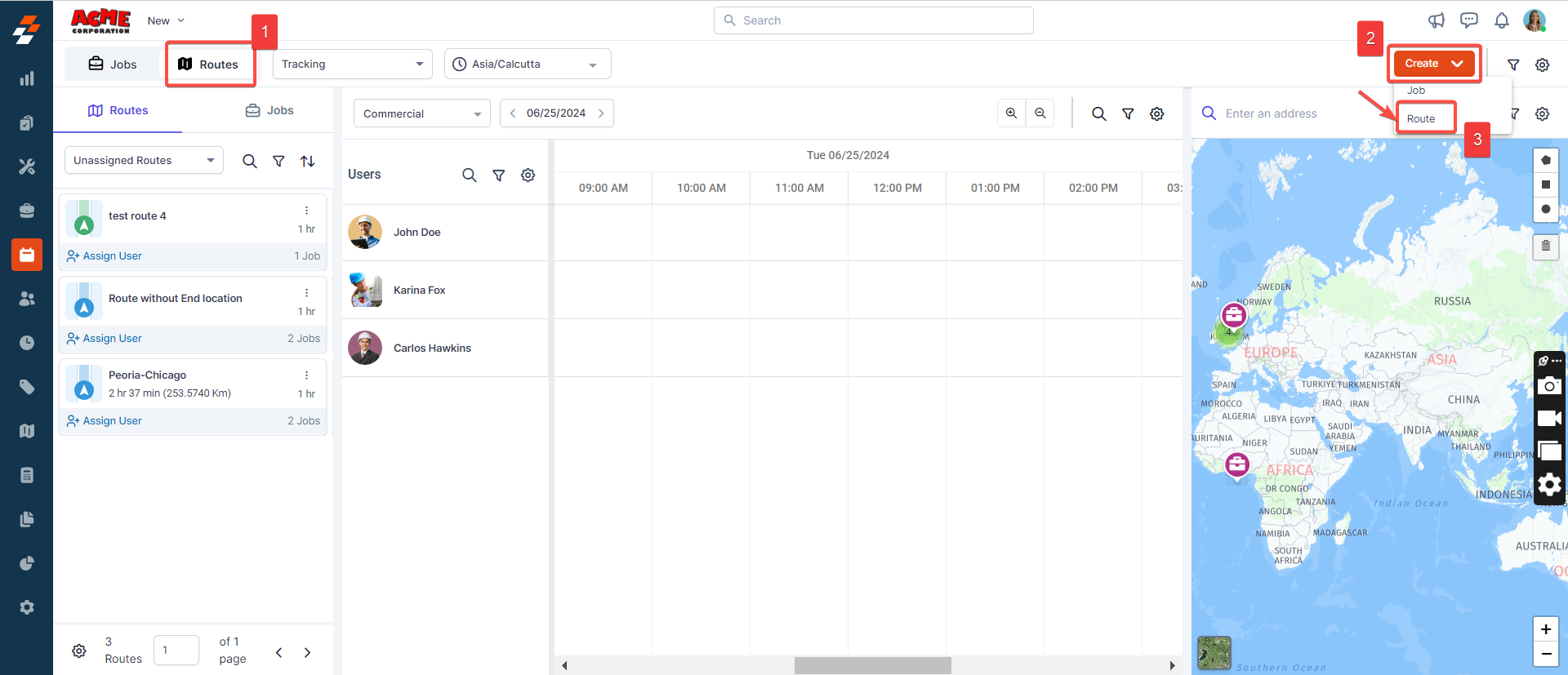 1. Select "Map” on the right and click “Show all routes” at the top. This will display all created routes on the map for the selected date, including recurring and one-off routes.