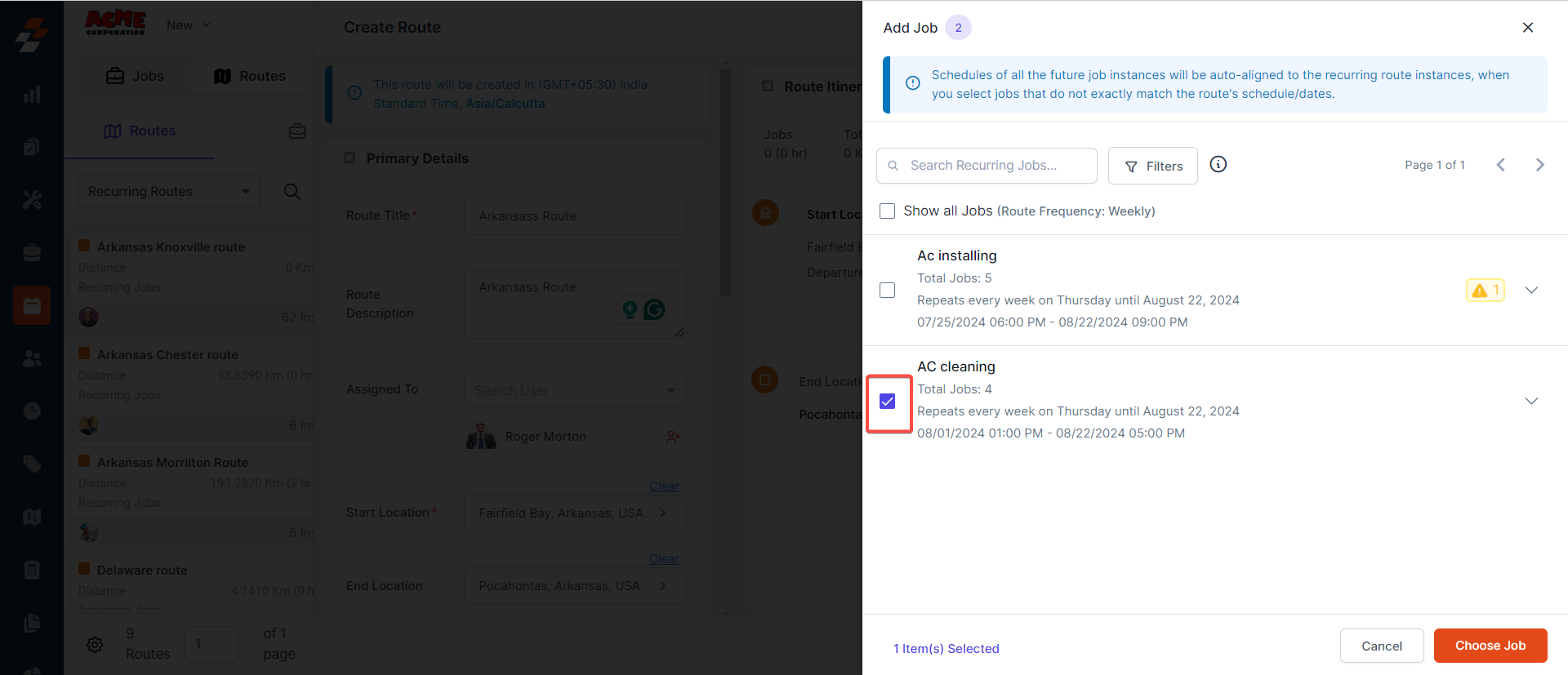 2. Select the recurring job(s) series that you want to this recurring route series.