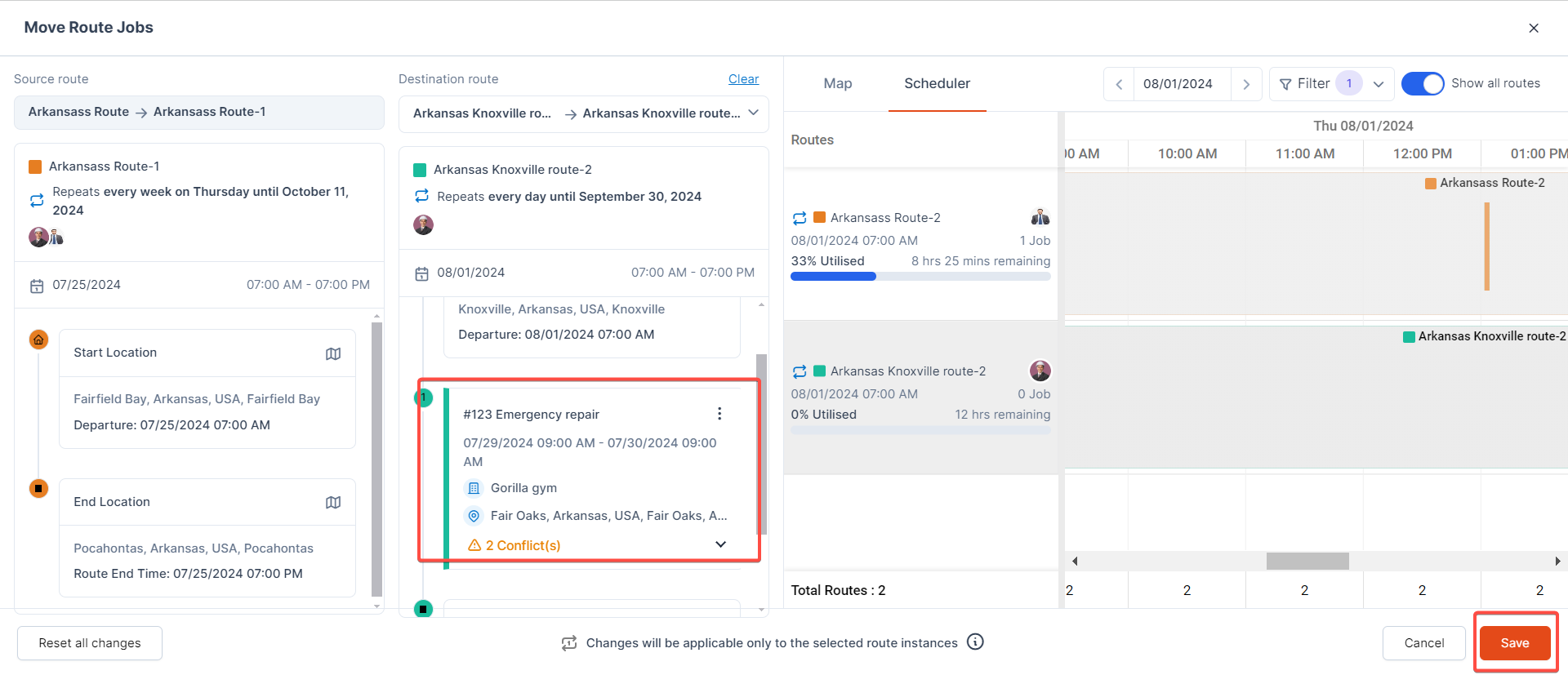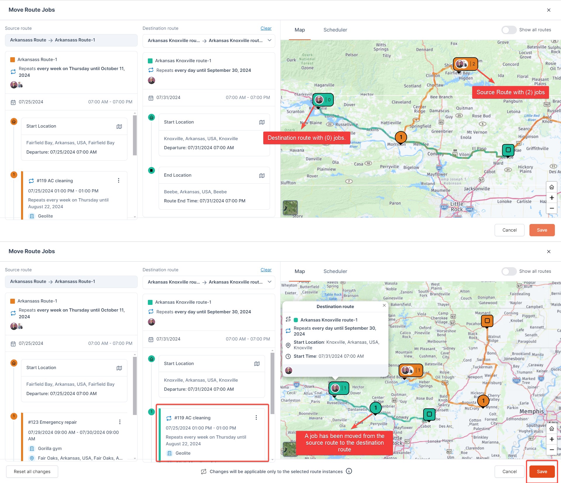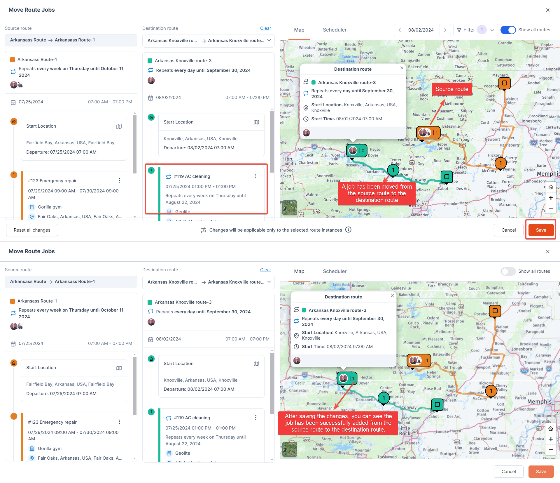 4. Once the route is set as destination route, you can then simply drag and drop the jobs that you want to move from the source route to the destination route and click the "Save" button. The job will be moved from the source route to the destination route successfully.