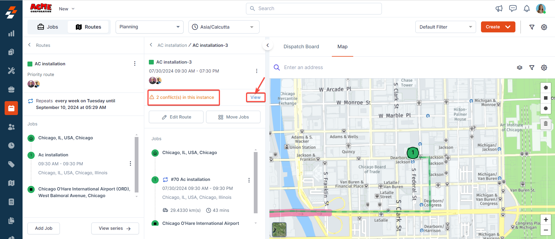 1. To view and manage any of the route instances within a route series, click the specific route instance. You can view details such as route instance name, occurrence date and time, associated user, jobs and conflicts (if any).